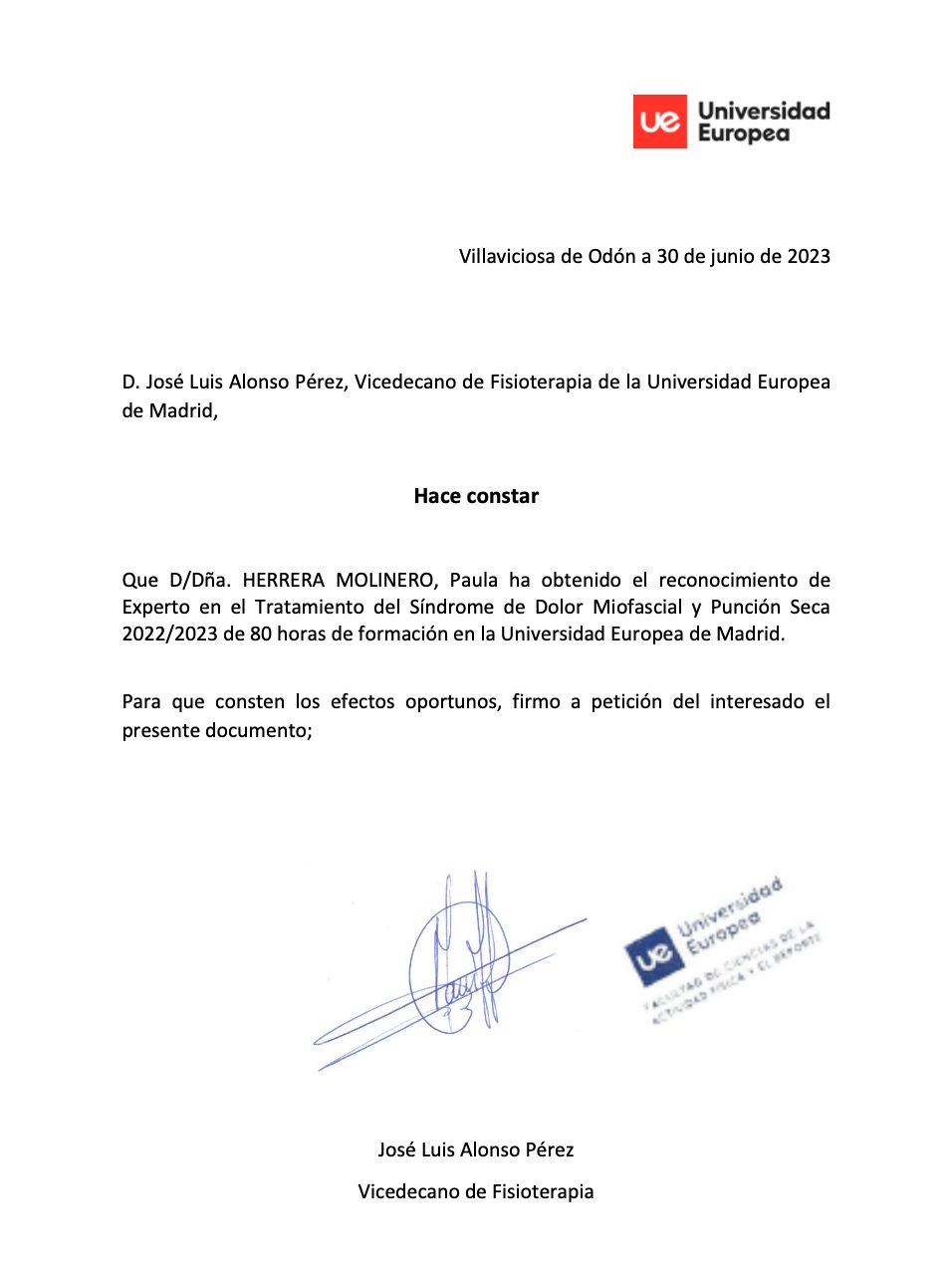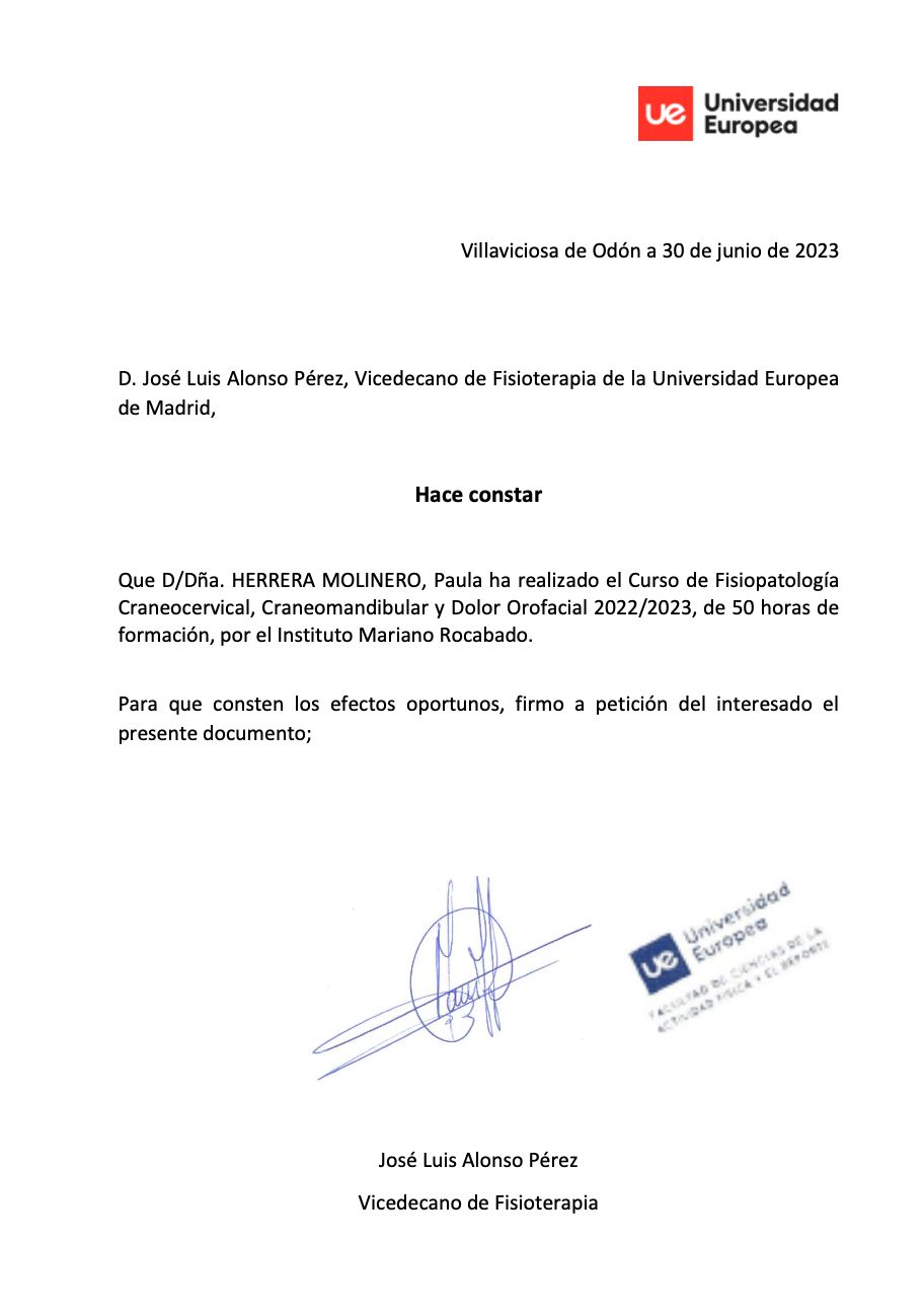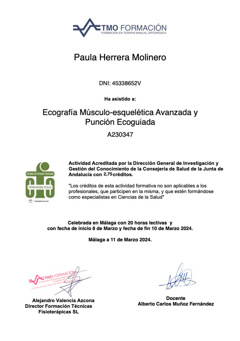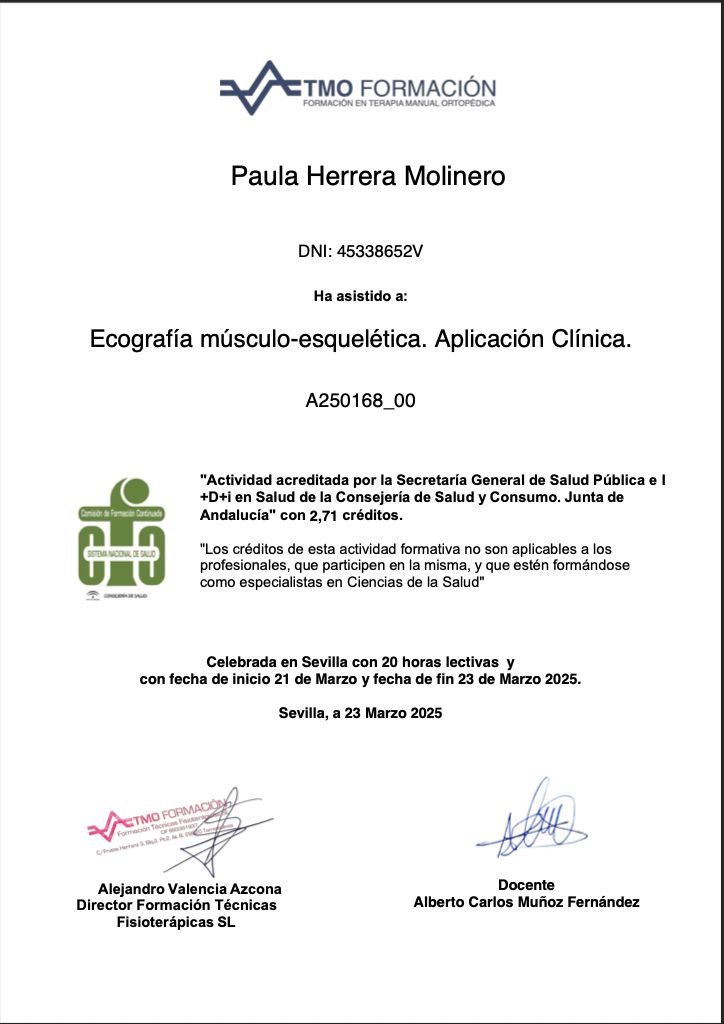 ¿Cuáles son las principales especialidades de Paula Herrera Molinero?Paula Herrera Molinero es fisioterapeuta. Te mostramos algunos de los servicios que ofrece gracias a su trayectoria y amplia experiencia: Visita Fisioterapia, Primera consulta de Fisioterapia, Electrólisis Percutánea Terapéutica (EPTE), Tratamiento del dolor, Terapia manual de la ATM, Fisioterapia invasiva, Tratamiento para el dolor cervical, Tratamiento del dolor de columna, Bruxismo y síndrome miofascial (tratamiento), Tratamiento capsulitis adhesiva / hombro congelado.