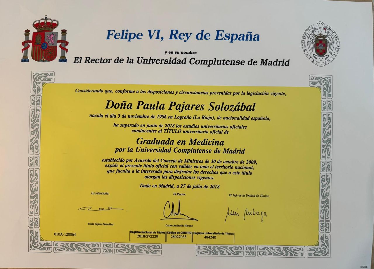 En 2018 se licencia en Medicina por la Universidad Complutense de Madrid (2012-2018) y se especializa vía Máster, en Medicina Estética por la Universidad de Alcalá.