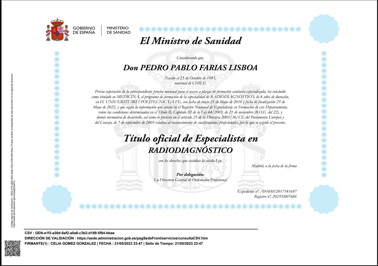 ¿Cuáles son las principales especialidades de Pedro Farias Lisboa?Pedro Farias Lisboa es radiólogo. Te mostramos algunos de los servicios que ofrece gracias a su trayectoria y amplia experiencia: Ecografía abdominal, Ecografía articular, Ecografía mamaria, Aspiración de tiroides con aguja fina, Ecografía musculoesquelética, Visitas sucesivas Radiología, Eco Doppler de troncos supraaórticos, Ecografía urológica, Eco Doppler venoso de extremidades, Infiltraciones ecoguiadas.
