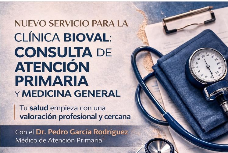 En Clínica Bioval seguimos ampliando nuestros servicios para cuidar de tu salud. Incorporamos consulta de Atención Primaria y Medicina General, atendida por el Dr. Pedro García Rodríguez.