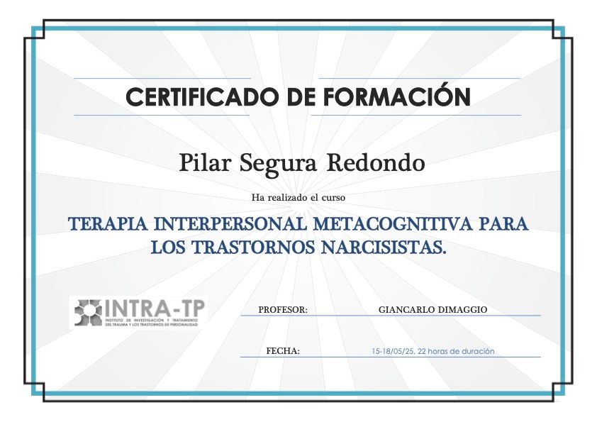 ¿Cuáles son las principales especialidades de Pilar Segura Redondo?Pilar Segura Redondo es psicóloga. Te mostramos algunos de los servicios que ofrece gracias a su trayectoria y amplia experiencia: Terapia de pareja, Psicoterapia individual, Psicoterapia EMDR, Terapia EMDR (Adultos), Terapia EMDR online, EMDR (Desensibilización y reprocesamiento por movimientos oculares), Psicoeducación, Consulta psicoterapia de pareja, Evaluación psicológica para adultos, Psicoterapia familiar.