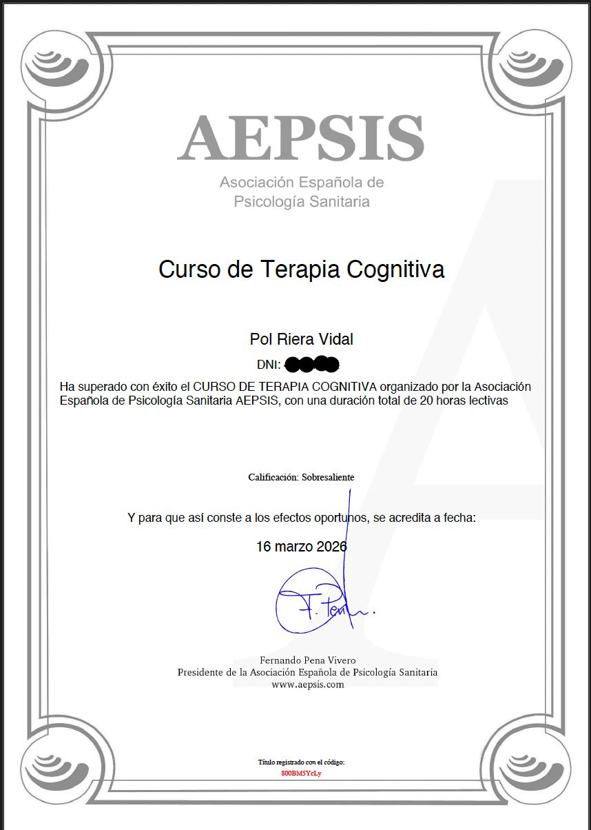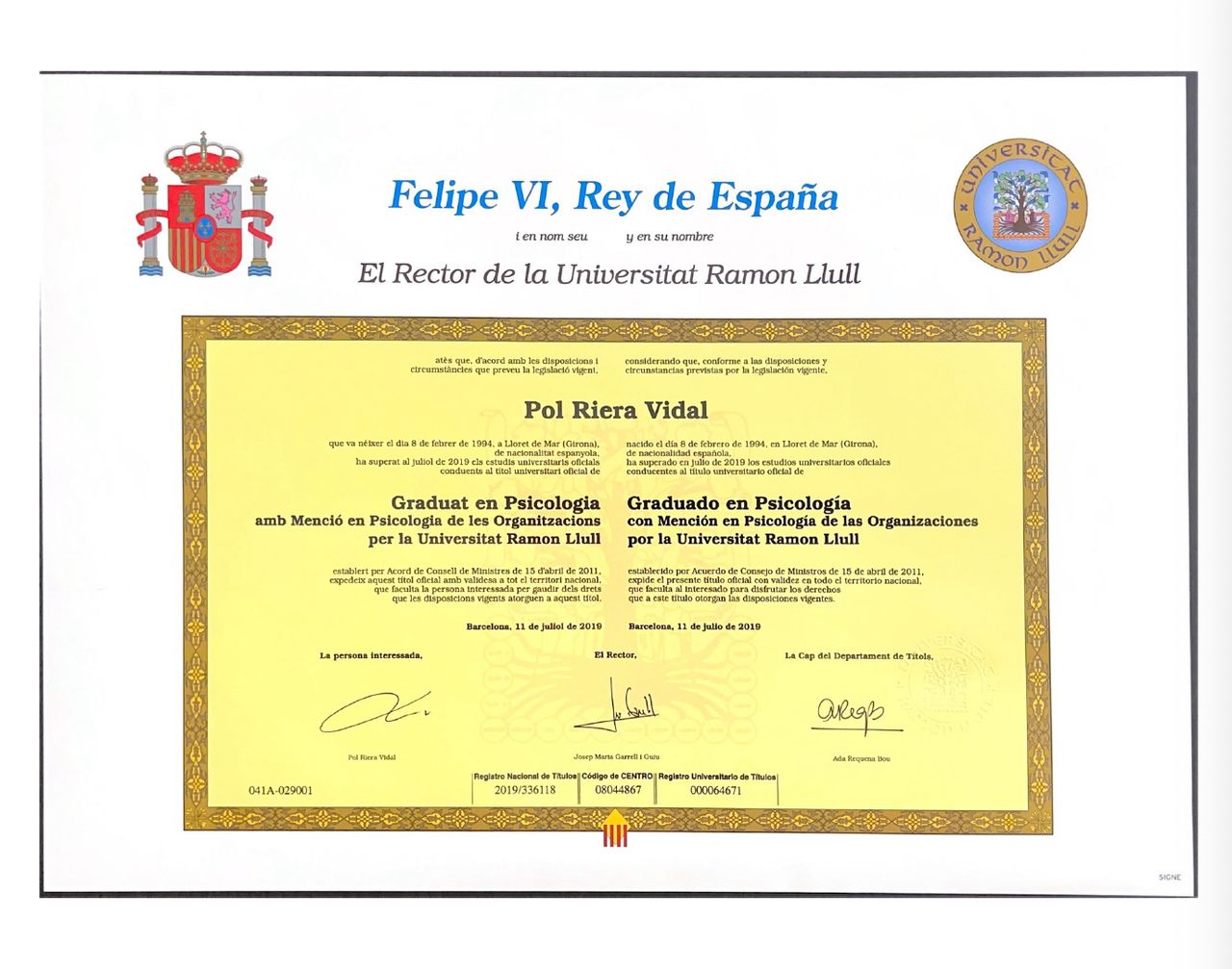 Sóc Pol Riera, psicòleg col·legiat número 33204 pel Col·legi Oficial de Psicologia de Catalunya. Em vaig graduar en Psicologia per la Facultat de Psicologia, Ciències de l'Educació i de l'Esport Blanquerna l'any 2019. A la mateixa institució, vaig completar el Màster en Psicologia General Sanitària i el Màster en Psicologia del Treball, Organitzacions i Recursos Humans.
