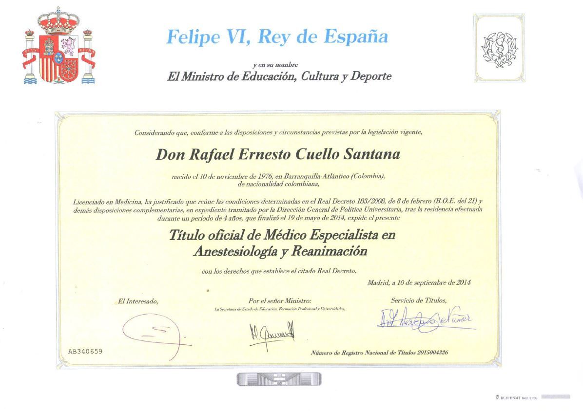 Especialista en Anestesiología, Reanimación y Terapia del Dolor
