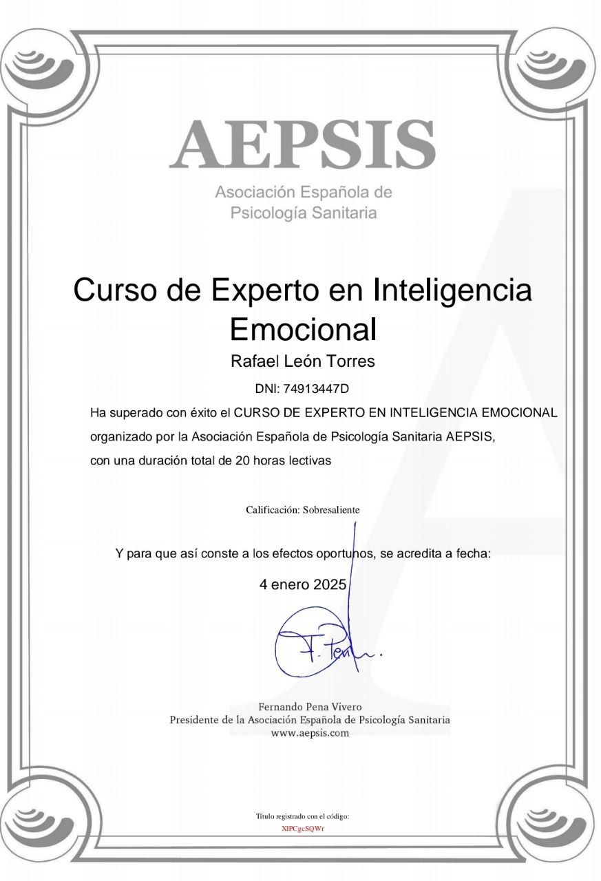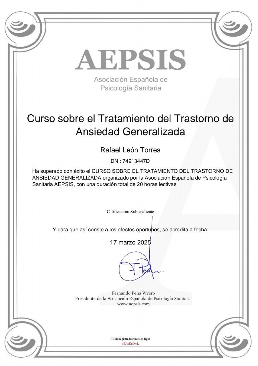 ¿Cuáles son las principales especialidades de Rafael León Torres?Rafael León Torres es psicólogo. Te mostramos algunos de los servicios que ofrece gracias a su trayectoria y amplia experiencia: Consulta online, Primera visita Psicología, Visitas sucesivas Psicología, Visita Psicología, Primera visita Psicología Infantil, Psicoterapia individual, Terapia cognitivo-conductual, Psicoterapia, Reestructuración cognitiva, Mindfulness.