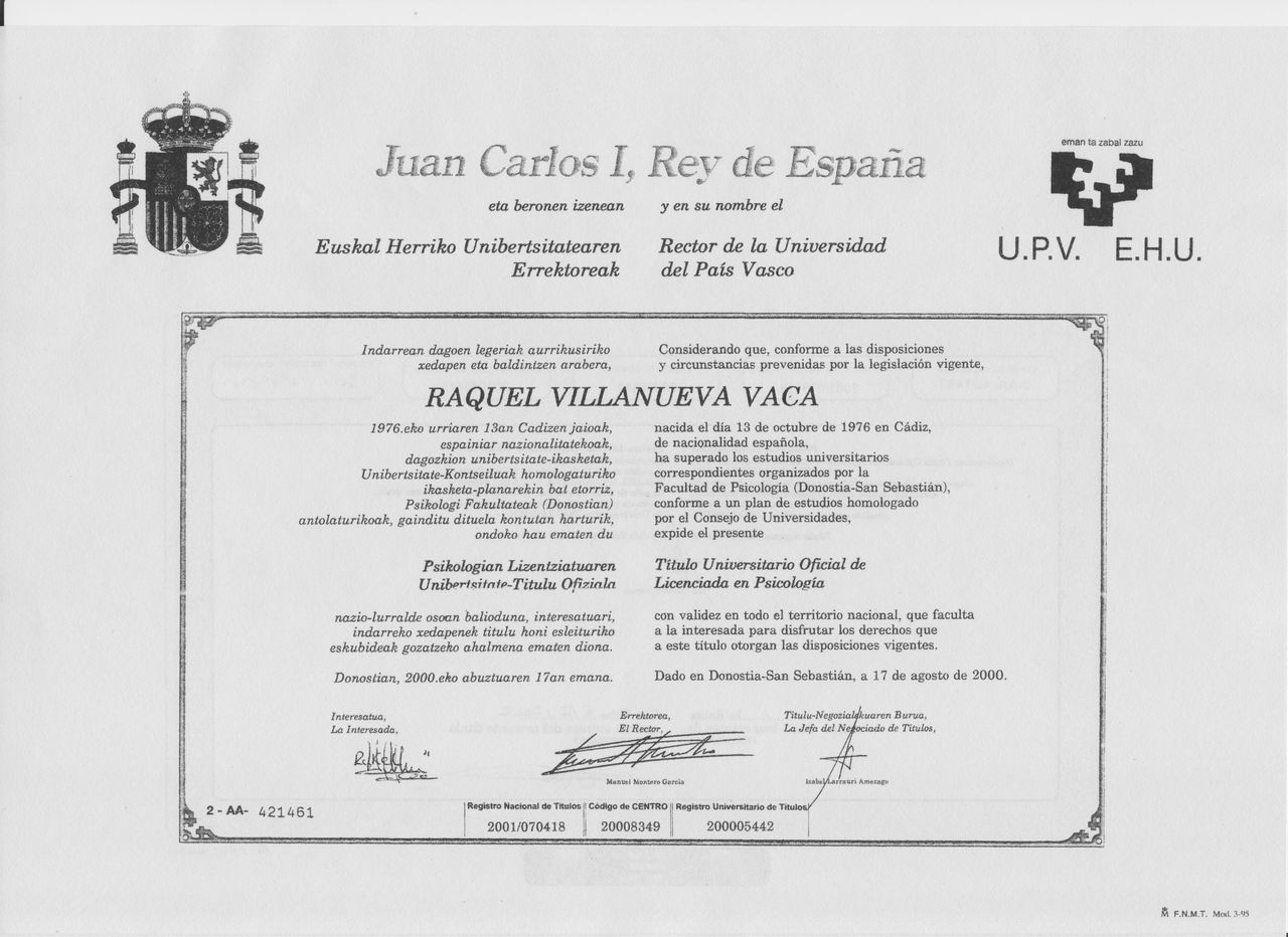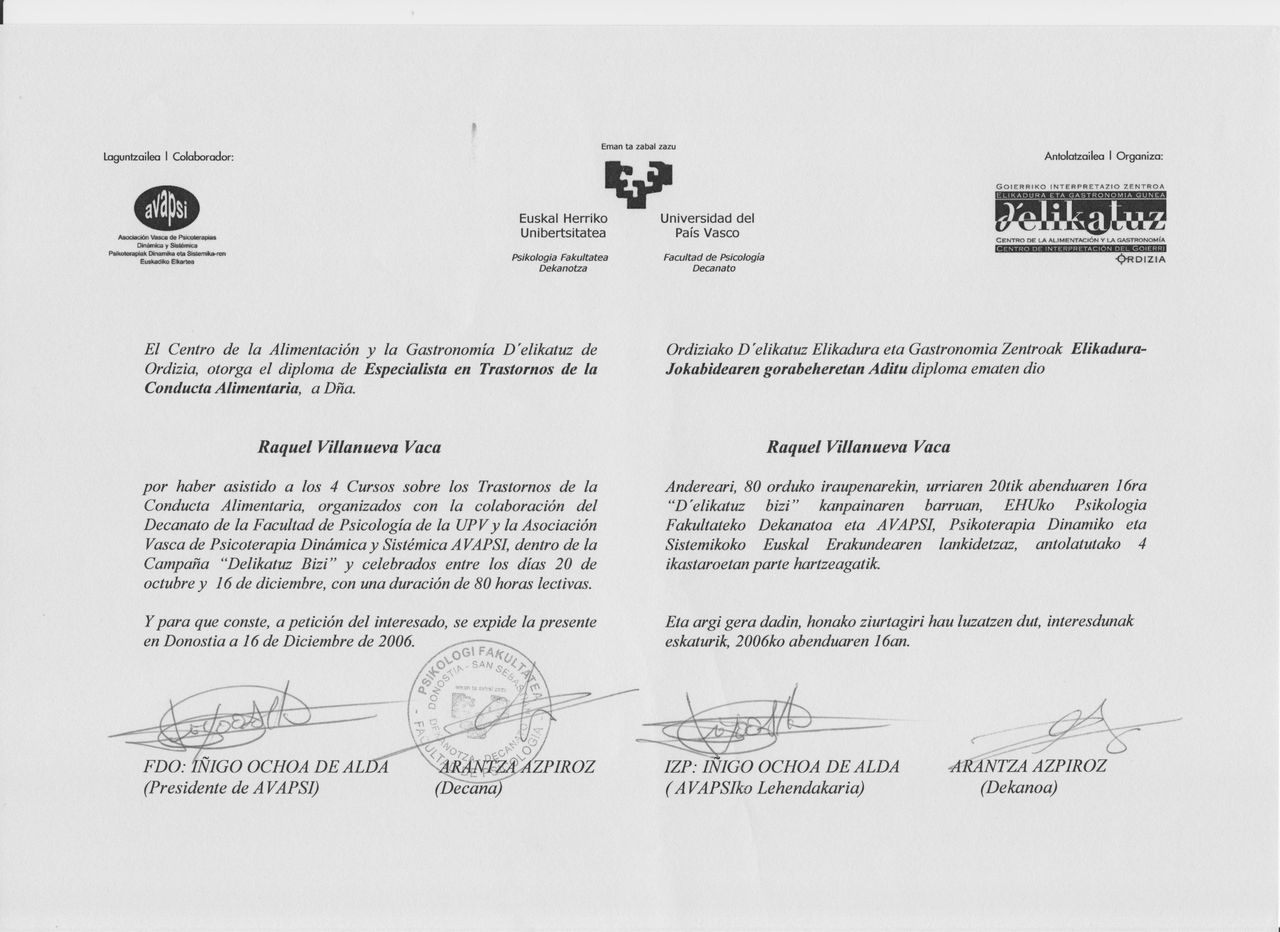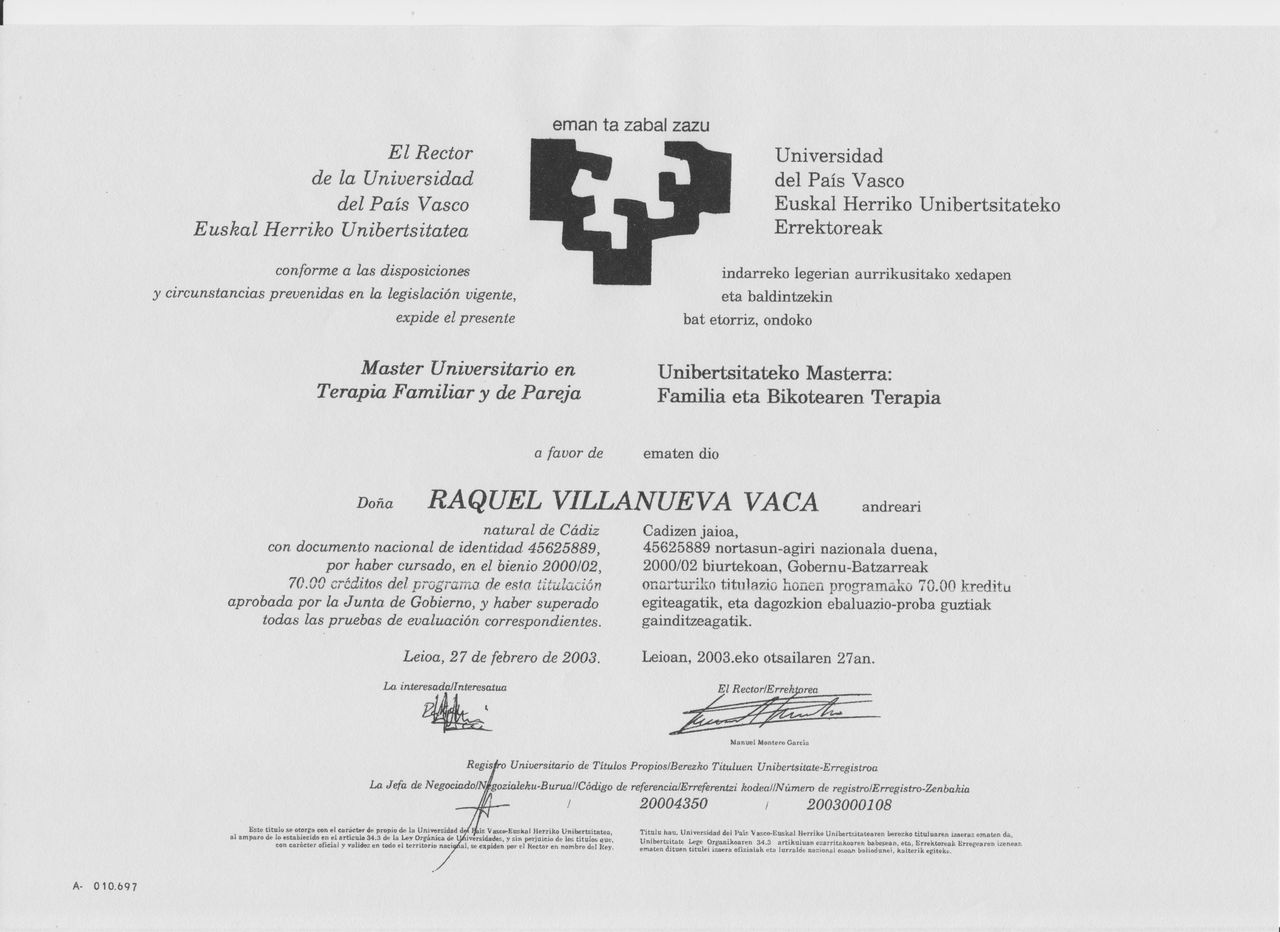 177 opinionesSoy Psicóloga general sanitaria y Terapeuta familiar y de pareja, tengo gran experiencia trabajando en diversos trastornos y dificultades psicológicas y de convivencia. Apasionada de este trabajo, del respeto y cuidado del ser humano, de las relaciones interpersonales y la comunicación humana. Obtengo gran éxito en mis intervenciones y estoy en continua formación para ampliar y renovar mis conocimientos. Psicóloga colegiada BI03951 Autorización sanitaria del Gobierno Vasco con Nº de registro: 48C.2.2.44556. R.P.S. 91/17 Disponemos de dos parkings rotatorios 2 horas gratis a 5 minutos caminando.