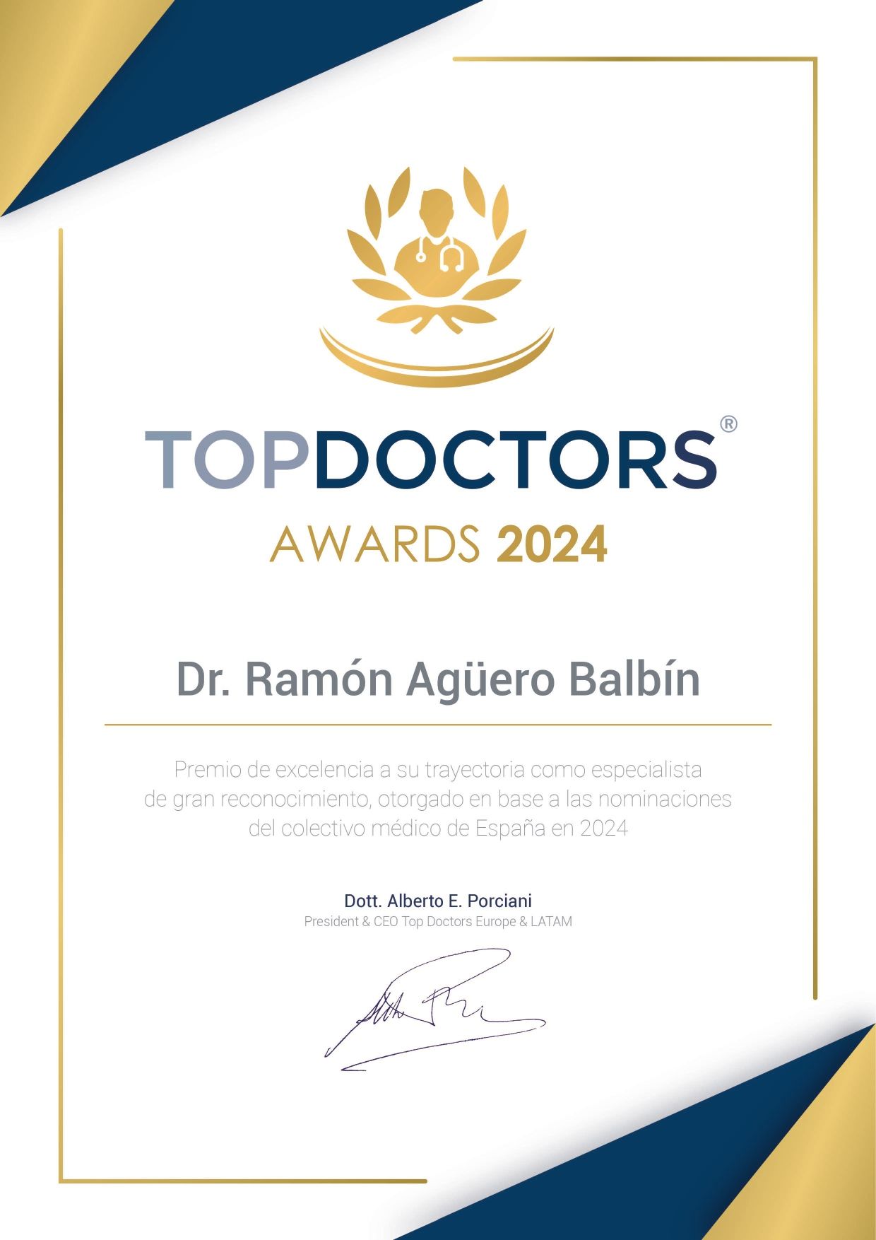 Un neumólogo de Cantabria, el doctor Ramón Agüero Balbín, se sitúa entre los 50 especialistas y médicos privados `Top Doctors`, en la XI edición de este reconocimiento, en el que los propios facultativos reconocen a sus compañeros por su formación y habilidades clínicas, según ha informado el grupo en un comunicado.