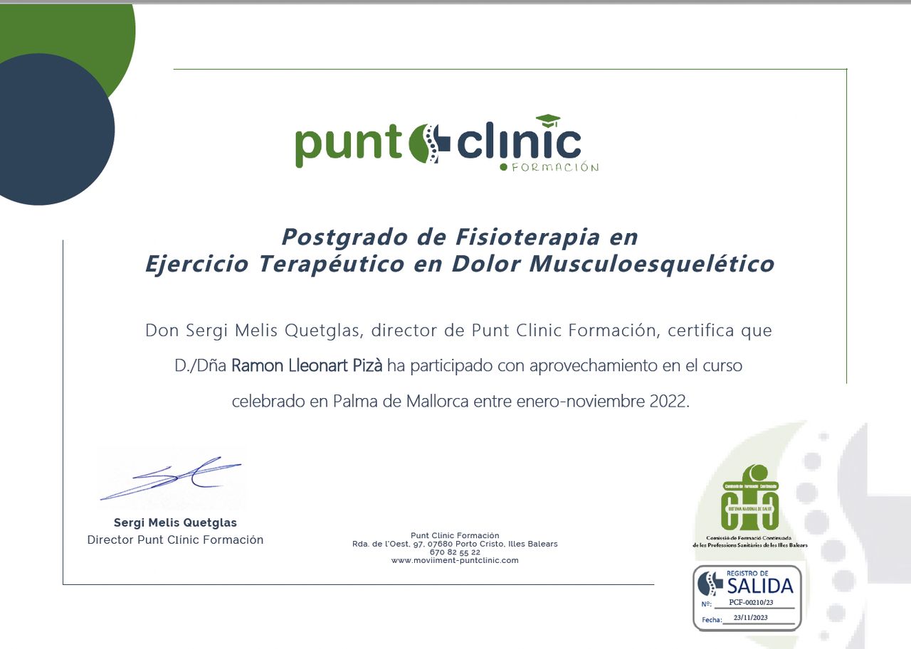 ¿Cuáles son las principales especialidades de Ramón Lleonart Pizá?Ramón Lleonart Pizá es fisioterapeuta. Te mostramos algunos de los servicios que ofrece gracias a su trayectoria y amplia experiencia: Visita Fisioterapia, Fisioterapia deportiva, Punción seca, Tecarterapia, Rehabilitación con Magnetoterapia, Fisioterapia con ecografía, Ecografía musculoesquelética, Rehabilitación, Rehabilitación postquirúrgica, Tratamiento de la tendinopatía crónica.