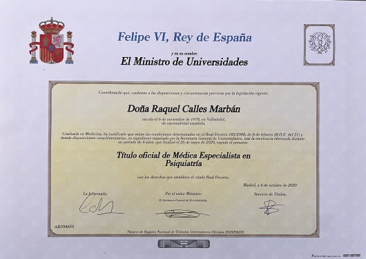 -Título de Especialista en Psiquiatría. Unidad Docente Multiprofesional de Salud Mental de Tenerife. Hospital Universitario de Canarias, Tenerife, 2020.