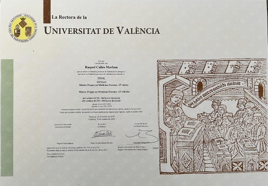 -Máster Propio en Medicina Forense impartido por la Universitat de Valencia, octubre 2018.