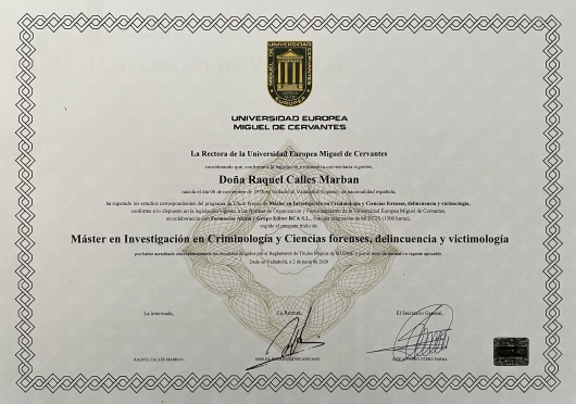 -Máster Propio en Investigación en Criminología y Ciencias Forenses, delincuencia y Victimología impartido por la Universidad Europea de Miguel de Cervantes, febrero 2020.