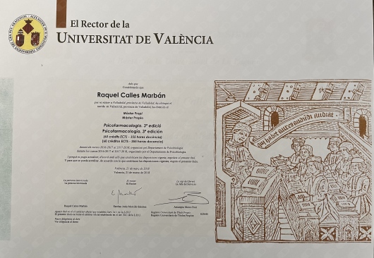 -Máster Propio en Psicofarmacología (3ª Ed.) impartido por la Universitat de Valencia,marzo de 2018.