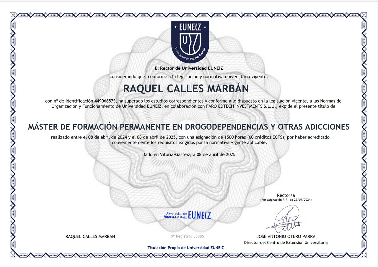 -Máster Propio en Investigación en Criminología y Ciencias Forenses, delincuencia y Victimología impartido por la Universidad Europea de Miguel de Cervantes, febrero 2020.