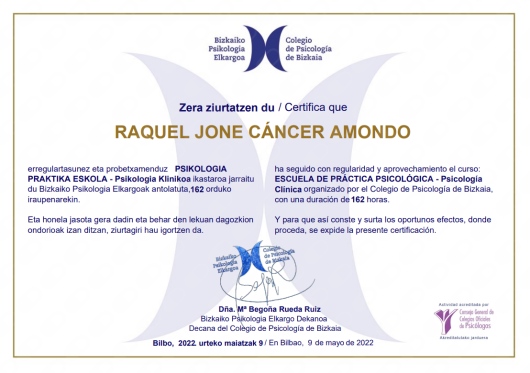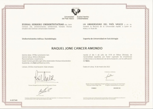 Me llamo Raquel Jone Cancer Amondo. Soy una persona apasionada e implicada en el trabajo con el bienestar y calidad de vida de las personas. Como psicoterapeuta ofrezco apoyo psicológico para hacer frente a dificultades como la depresión, la ansiedad, el estrés postraumático, la disociación o acompañamiento en procesos de duelo. Estoy especializada en el tratamiento del suicidio, dirigido tanto a personas con conducta suicida como a familiares y/o personas allegadas que han perdido a un ser querido por suicidio. La terapia también puede estar orientada al descubrimiento y crecimiento personal, poniendo el foco en aspectos del autoconcepto y la autoestima, el afrontamiento y la gestión de conflictos, la comunicación asertiva y el desarrollo de habilidades sociales.