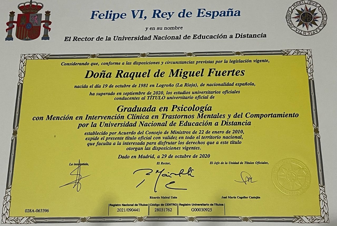¿Cuáles son las principales especialidades de Raquel De Miguel Fuertes?Raquel De Miguel Fuertes es psicóloga. Te mostramos algunos de los servicios que ofrece gracias a su trayectoria y amplia experiencia: Consulta de psicología, Acompañamiento emocional, Terapia para la depresión, Terapia para ansiedad, Entrenamiento en habilidades sociales, Tratamiento de fobias, Tratamiento para creencias limitantes, Problemas de inseguridad y autoestima, Gestión del estrés, Tratamiento para crisis personal.
