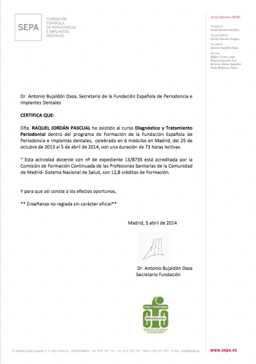 -Curso Diagnóstico y Tratamiento Periodontal dentro del programa de Formación de la Fundación Española de Periodoncia e Implantes dentales, Madrid, 2014