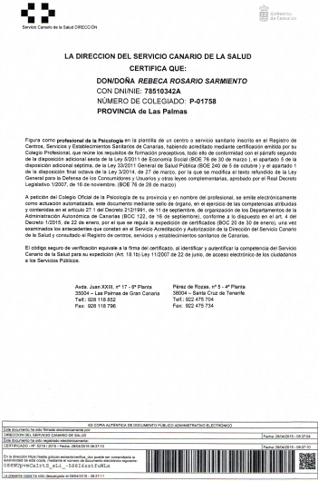 ¿Cuáles son las principales especialidades de Rebeca Rosario Sarmiento?Rebeca Rosario Sarmiento es psicóloga, psicóloga infantil. Te mostramos algunos de los servicios que ofrece gracias a su trayectoria y amplia experiencia: Terapia familiar, Primera visita Psicología, Terapia sexual, Terapia individual, Terapia de conducta, Terapia de pareja, Diagnóstico y tratamiento para trastornos de ansiedad, Desintoxicación y deshabituación a drogas, Visita domiciliaria Psicología, Primera visita Psicología Infantil.