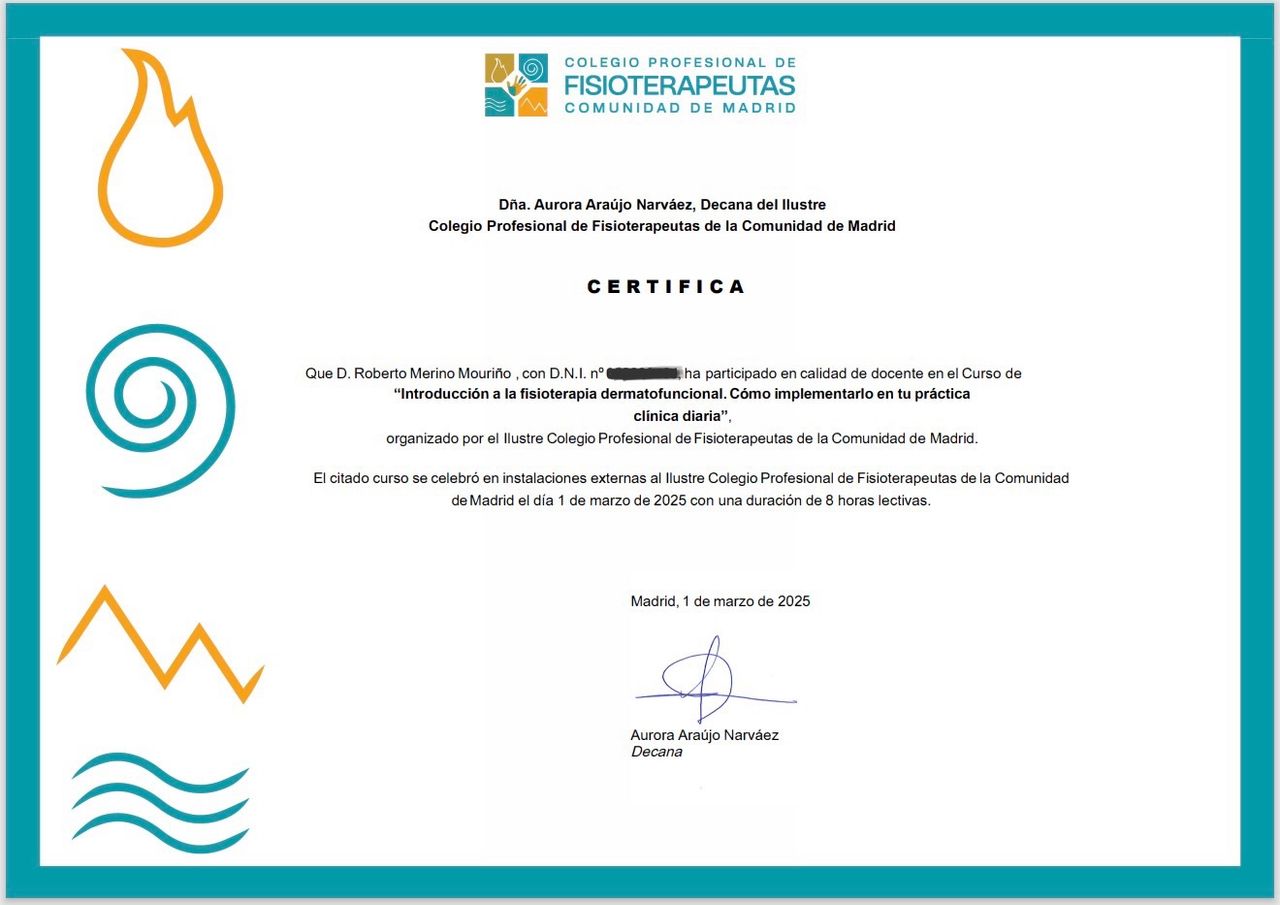 Colegiado n° 11.658, Colegio Oficial de Fisioterapeutas de Madrid.