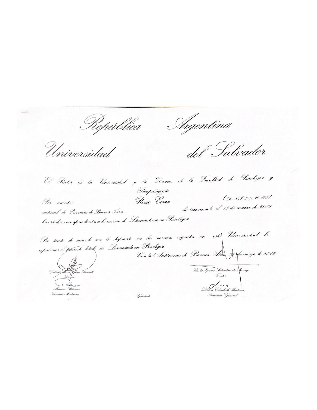 ¿Cuáles son las principales especialidades de Rocio Cerra?Rocio Cerra es psicóloga. Te mostramos algunos de los servicios que ofrece gracias a su trayectoria y amplia experiencia: Consulta online, Videoconsulta online, Tratamiento en problemas de ansiedad y estrés (sesiones online), Seguimiento online, Asesoría psicológica online, Terapia online, Psicología online, Tratamiento en autoestima (sesiones online), Psicoterapia online (visitas sucesivas), Atención psicológica por videoconferencia.