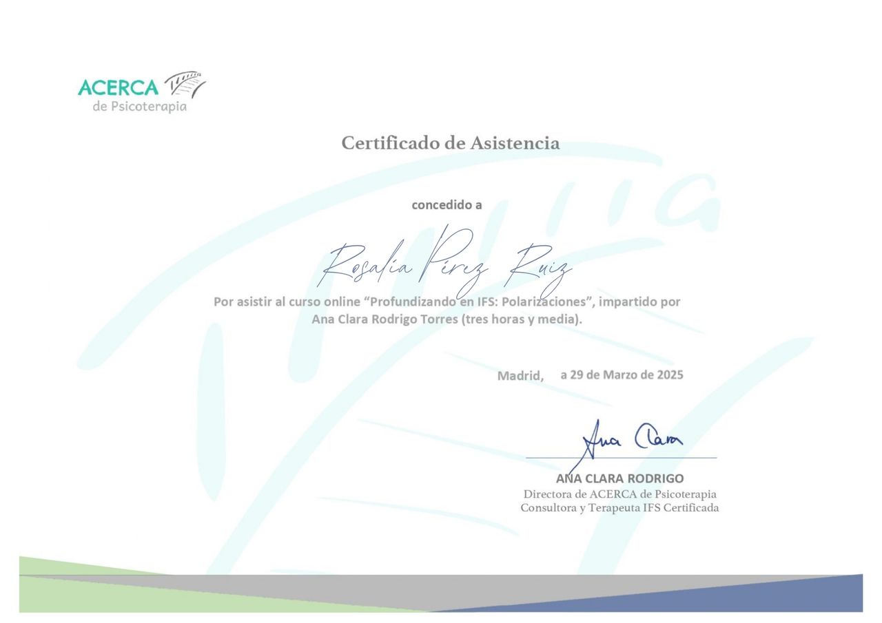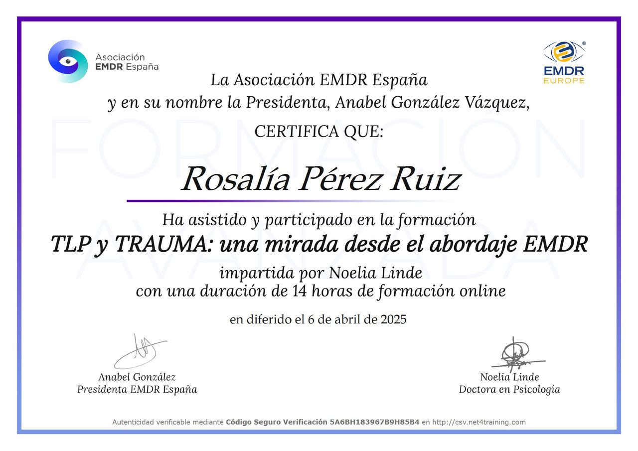 Comenzamos en Enero con mi diagnóstico TDAH y trauma complejo, a día de hoy estamos en la fase final de EMDR, Rosalia me ha ayudado a entender mi neurodivergencia y mejorar mi vida a pasos agigantados, MUY AGRADECIDA!