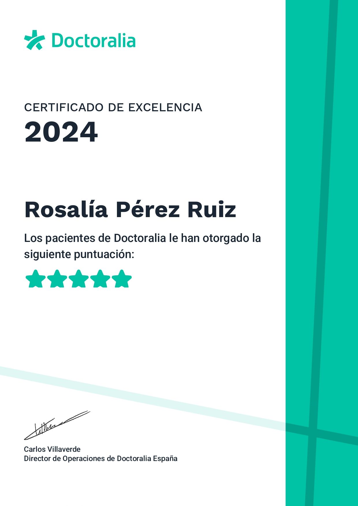 ¿Qué opinan los pacientes de Rosalía Pérez Ruiz?Un total de 22 pacientes han querido dejar una opinión sincera y real sobre Rosalía Pérez Ruiz, otorgándole además una valoración media de 5 estrellas (sobre un máximo de 5).
