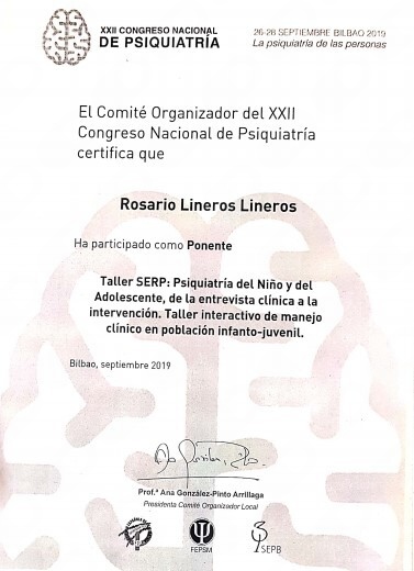 ¿Cuáles son las principales especialidades de Rosario Lineros?Rosario Lineros es psiquiatra infantil, terapeuta complementario, psiquiatra. Te mostramos algunos de los servicios que ofrece gracias a su trayectoria y amplia experiencia: Primera visita Psiquiatría Infantil, Terapia familiar, Psicoterapia infantil, Visitas sucesivas Psiquiatría Infantil, Visita Psiquiatría Infantil, Psicoterapia en adolescentes, Diagnóstico y tratamiento de los trastornos bipolares, Diagnóstico y tratamiento para trastornos de ansiedad, Diagnóstico y tratamiento de los trastornos depresivos, Diagnóstico y tratamiento para la depresión.