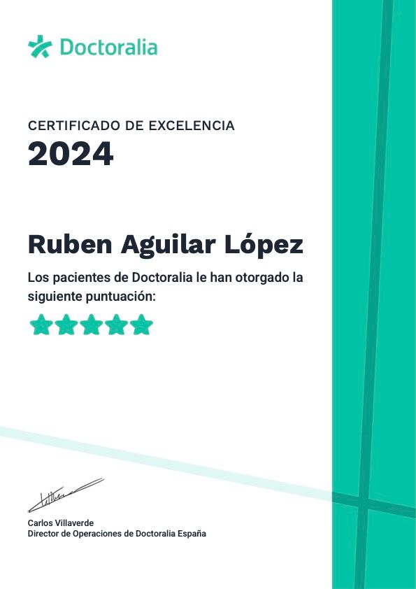 ¿Cómo puedo reservar una cita con Ruben Aguilar López?El calendario que muestra Ruben Aguilar López en Doctoralia está actualizado en tiempo real, por lo que solo tienes que elegir qué día y hora te va mejor de entre las disponibles. La reserva es gratuita, y además recibes un recordatorio antes de la visita.