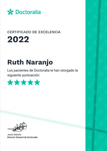 ¿Qué opinan los pacientes de Ruth Naranjo Parra?Un total de 62 pacientes han querido dejar una opinión sincera y real sobre Ruth Naranjo Parra, otorgándole además una valoración media de 5 estrellas (sobre un máximo de 5).