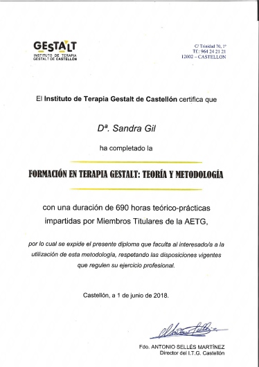 Mi nombre es Sandra Gil Lusa, soy Psicóloga General Sanitaria, Terapeuta Gestalt y Experta PAS. Si has llegado hasta aquí y estás leyendo estas palabras que te comparto, es porque de algún modo, estás buscando acompañamiento en algún proceso personal. Me alegra decirte que estoy aquí para acompañarte en tu camino de desarrollo personal. Llevo desde 2008 acompañando a todas aquellas personas que han dado el SÍ a querer superar obstáculos, dificultades, miedos, bloqueos, etc. solos o acompañados por sus parejas y/o hijos. Y, ¿cómo lo hago? a través de la comunicación empática, la escucha activa y libre de juicio, el respeto, la confianza y el trato cálido. Todas esas cualidades aúnan fuerzas con las diversas herramientas terapéuticas en las que me apoyo para así poder crear junto a ti un entorno seguro en el que poder explorarte, conocerte, expandirte y sanarte. Sí, has leído bien, sanarte. Porque tú y solo tú, eres el responsable de tu transformación. Yo estoy aquí para guiarte y acompañarte. ¿Qué me dices?