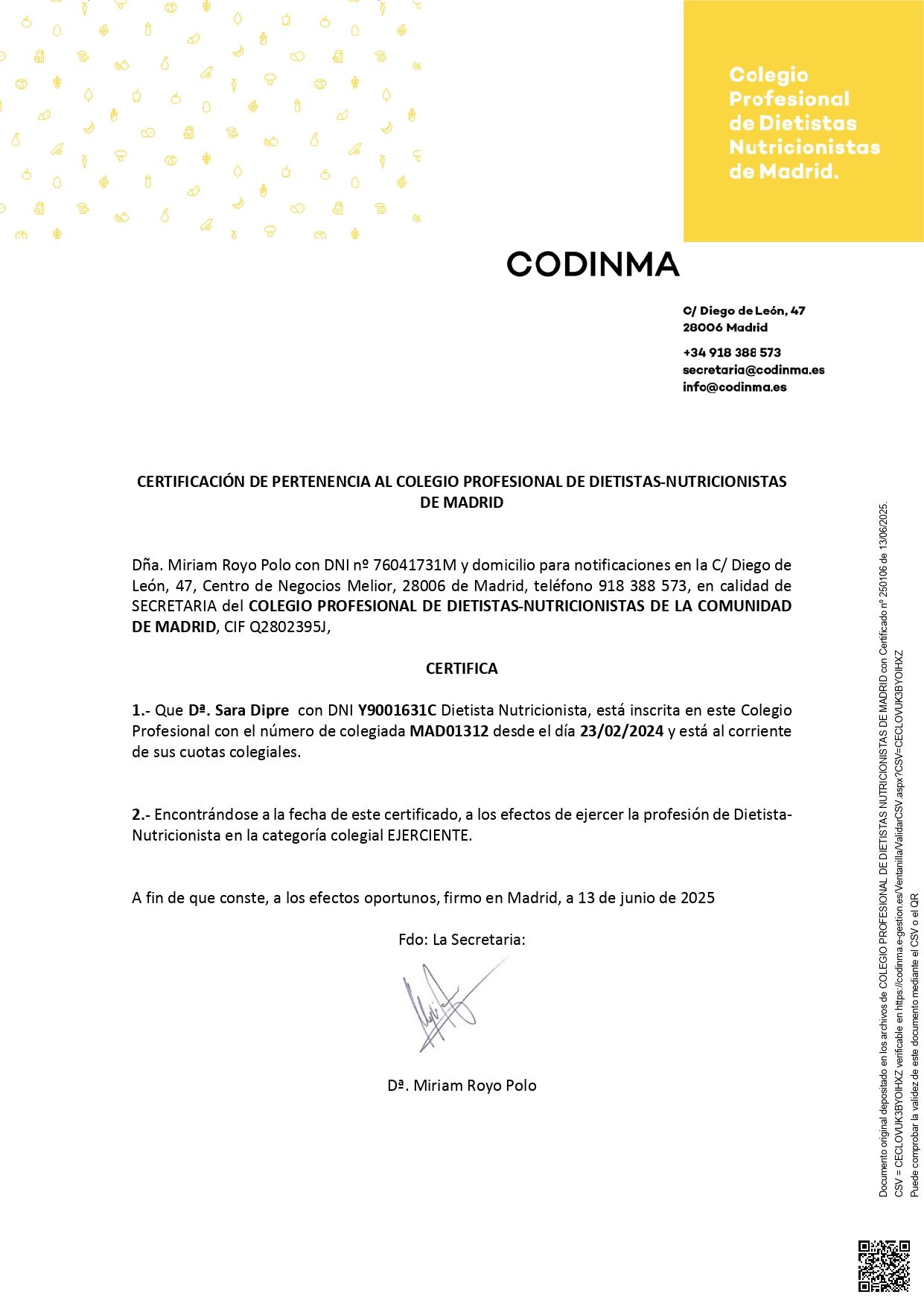 ¿Cuáles son las principales especialidades de Sara Dipre?Sara Dipre es dietista nutricionista. Te mostramos algunos de los servicios que ofrece gracias a su trayectoria y amplia experiencia: Primera visita Nutrición y Dietética, Visitas sucesivas Nutrición y Dietética, Psiconutrición, Consulta gratuita, Primera visita de dietética y nutrición, Consulta online, Consulta online (visitas sucesivas), Nutrición Online, Tratamiento para trastornos de alimentación.