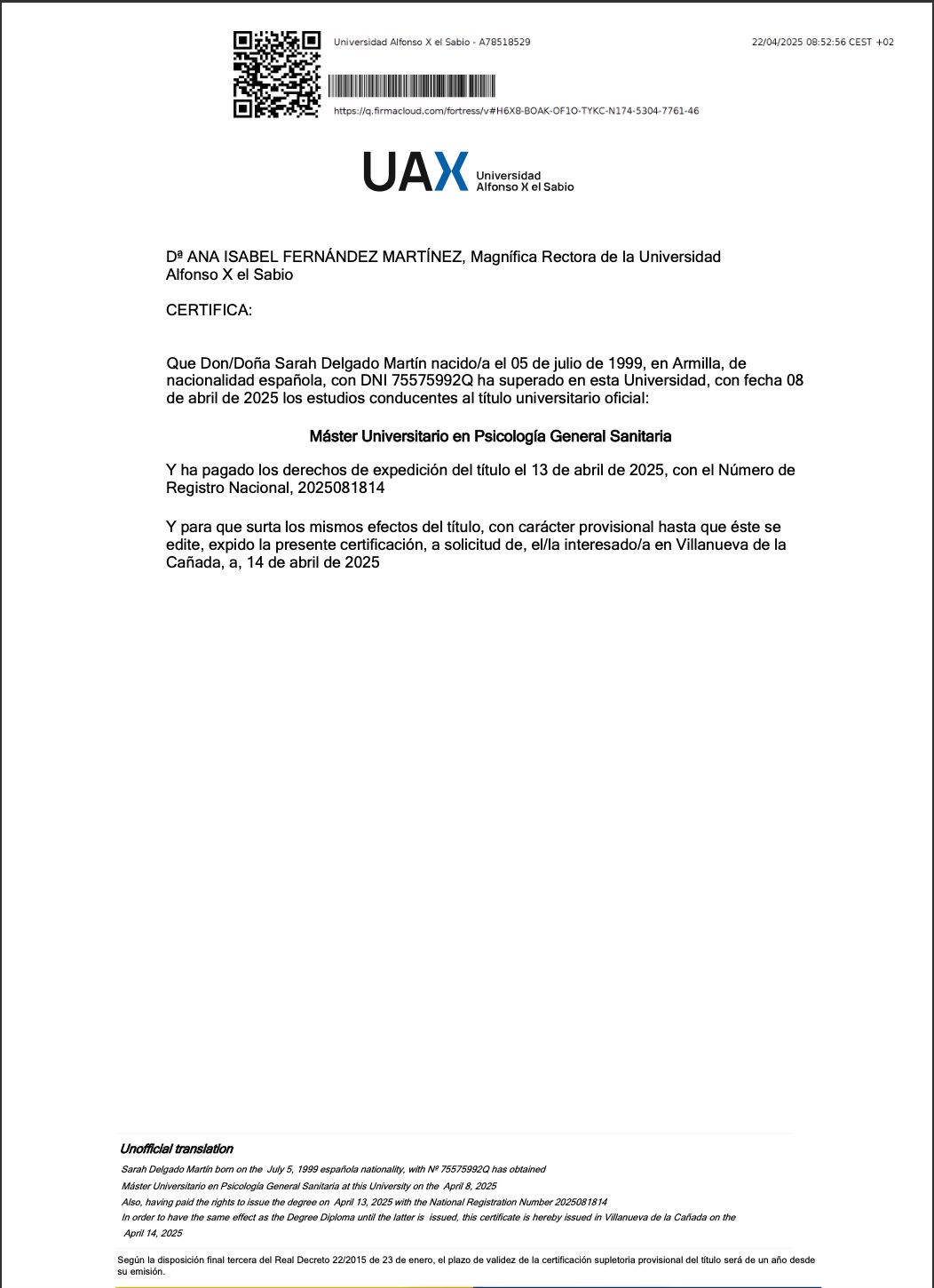 Tuve la oportunidad de tener una sesión con Sarah y la verdad es que me ha ayudado muchísimo. Desde el primer momento transmite cercanía y confianza, lo que hace que sea muy fácil abrirse y hablar.