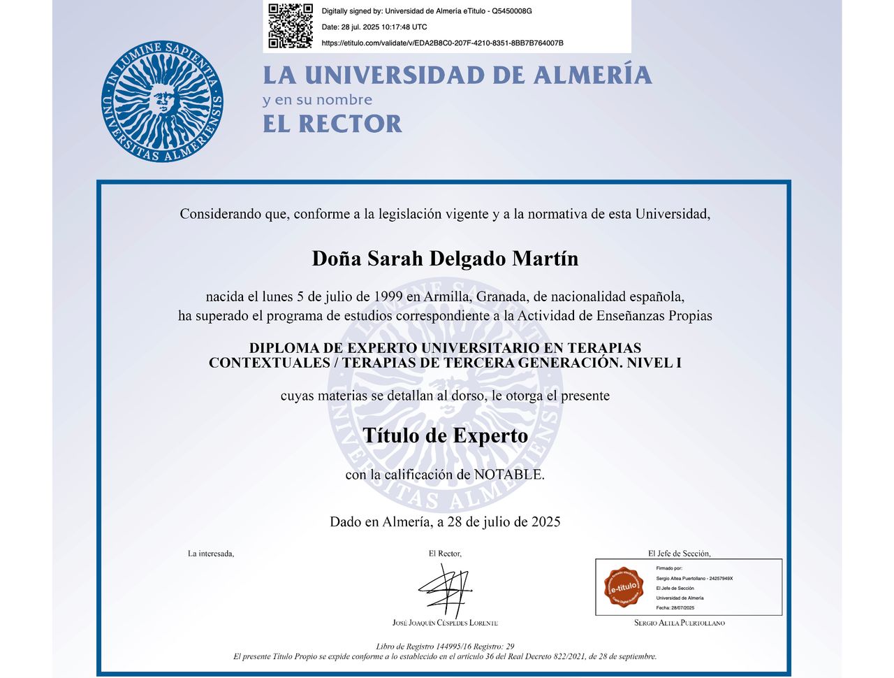 Me he formado en terapias de tercera generación y análisis de conducta, con un enfoque centrado en ayudarte a tomar decisiones alineadas con tus valores y a relacionarte de forma más flexible con tus emociones y pensamientos difíciles.