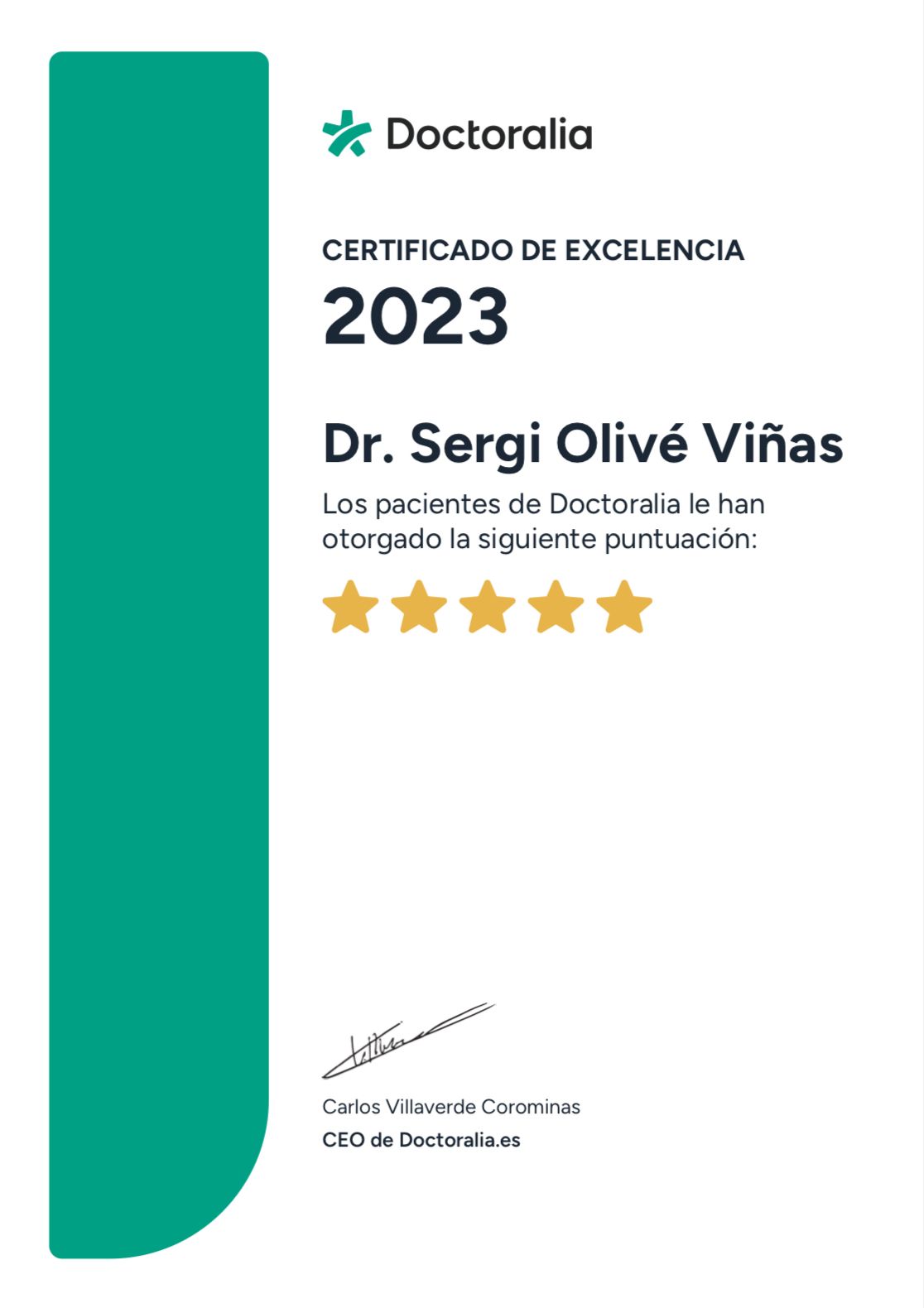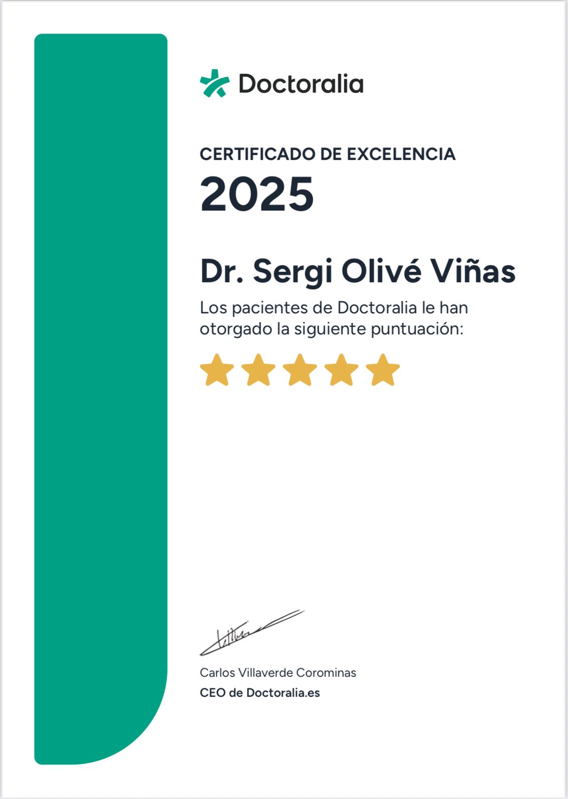 ¿Qué opinan los pacientes de Sergi Olivé Viñas?Un total de 207 pacientes han querido dejar una opinión sincera y real sobre Sergi Olivé Viñas, otorgándole además una valoración media de 5 estrellas (sobre un máximo de 5).