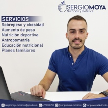 ¿Cuáles son las principales especialidades de Sergio Moya Amador?Sergio Moya Amador es dietista nutricionista. Te mostramos algunos de los servicios que ofrece gracias a su trayectoria y amplia experiencia: Primera visita Nutrición y Dietética, Tratamientos para el bajo peso y la desnutrición, Tratamiento nutricional en la hipercolesterolemia, Seguimiento online, Educación nutricional, Asesoramiento dietético, Visitas sucesivas Nutrición y Dietética, Dieta para el colesterol, Consulta online, Tratamientos para el sobrepeso y la obesidad.