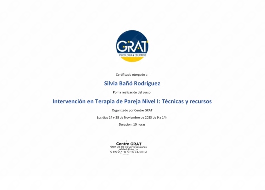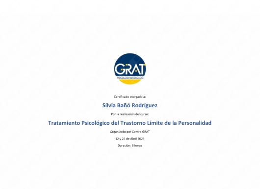 ¿Cuáles son las principales especialidades de Sílvia Bañó Rodriguez?Sílvia Bañó Rodriguez es psicóloga, psicóloga infantil. Te mostramos algunos de los servicios que ofrece gracias a su trayectoria y amplia experiencia: Consulta online, Terapia online, Coaching personal, Consulta psicológica online, Terapia de pareja online, Terapia familiar online, Psicología online, Primera visita Psicología, Estrategias terapéuticas en comunicación y habilidades sociales, Modificación del estilo de vida.
