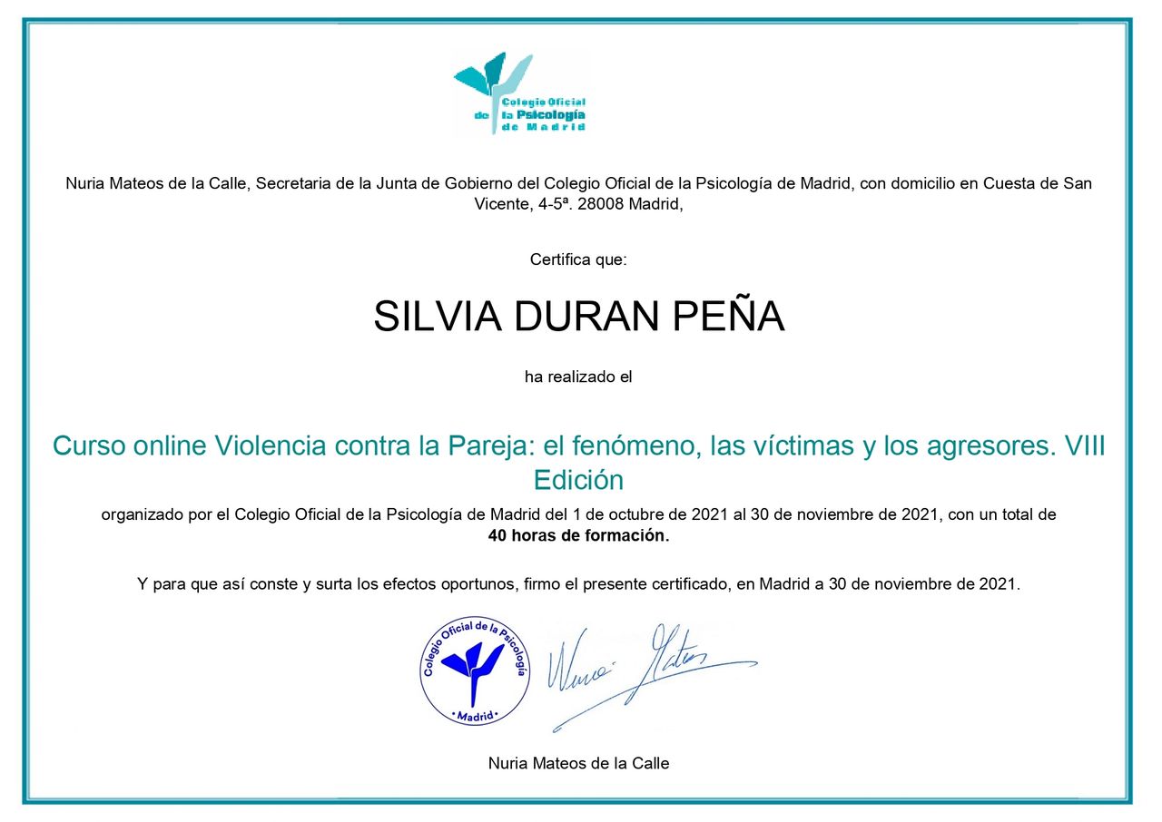Silvia Durán fue desde el primer momento muy comprensiva y atenta, intentando siempre mantener una energía positiva y un ambiente muy agradable para tratar todo tipo de temas. La terapia con ella me ayudó mucho con mi situación.