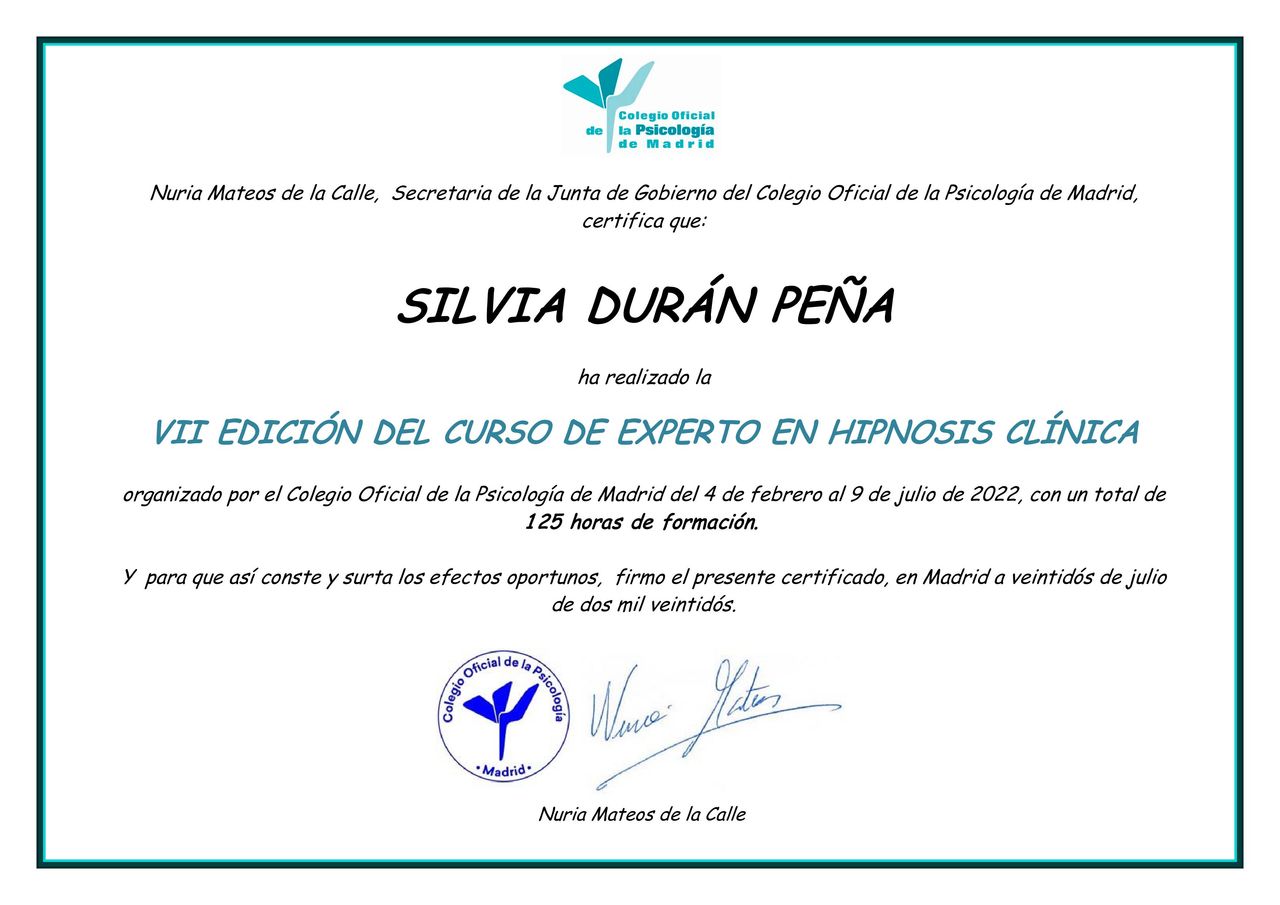 ¿Cuáles son las principales especialidades de Silvia Durán Peña?Silvia Durán Peña es psicólogo. Te mostramos algunos de los servicios que ofrece gracias a su trayectoria y amplia experiencia: Primera visita Psicología, Terapia psicológica, Relajación, Terapia cognitivo-conductual, Terapia humanista, Hipnosis clínica, Terapia individual, Consulta online, Tratamiento en problemas de ansiedad y estrés (sesiones online), Terapia de pareja online.