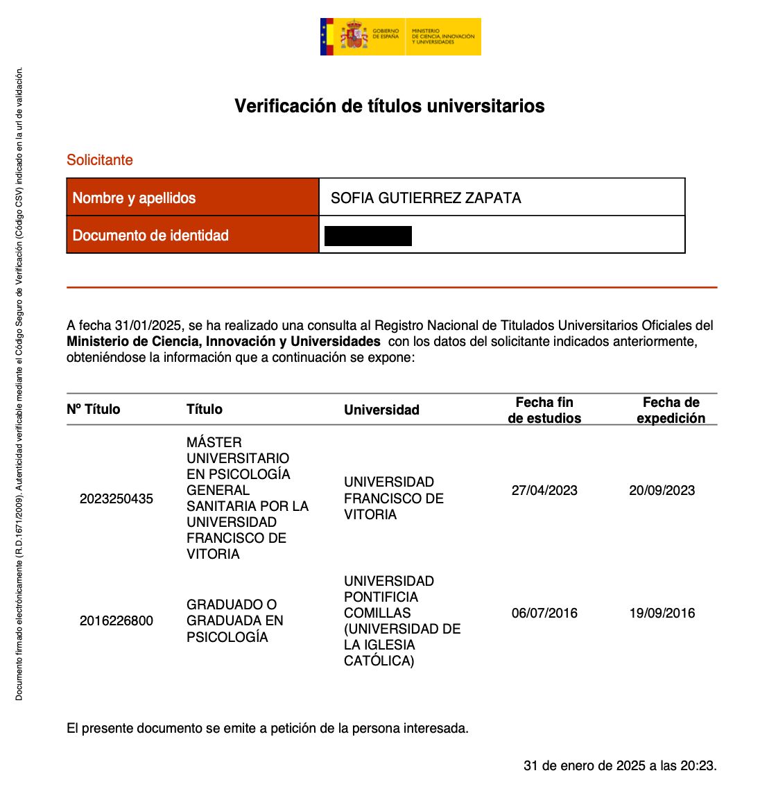 Tuve la suerte de trabajar con Sofía y la experiencia ha sido muy positiva. Desde el principio, su trato cercano y profesional me hizo sentir en confianza. Durante las sesiones, su capacidad para escuchar y ofrecer consejos prácticos me permitió ver las cosas desde una nueva perspectiva. Sofía tiene una forma de trabajar muy realista, basada en estrategias útiles que realmente marcan la diferencia. La recomiendo sin duda a quien busque apoyo profesional.