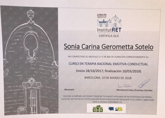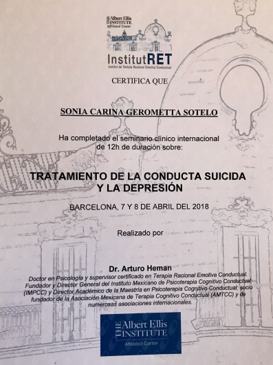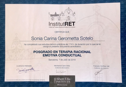 ¿Cuáles son las principales especialidades de Sonia Carina Gerometta Sotelo?Sonia Carina Gerometta Sotelo es psicóloga. Te mostramos algunos de los servicios que ofrece gracias a su trayectoria y amplia experiencia: Desensibilización sistemática, Inoculación del estrés, Reestructuración cognitiva, Psicoterapia individual, Relajación, Terapia cognitivo-conductual, Visitas sucesivas Psicología, Visita Psicología, Acompañamiento psicológico en el proceso personal, Acompañamiento en el proceso profesional.