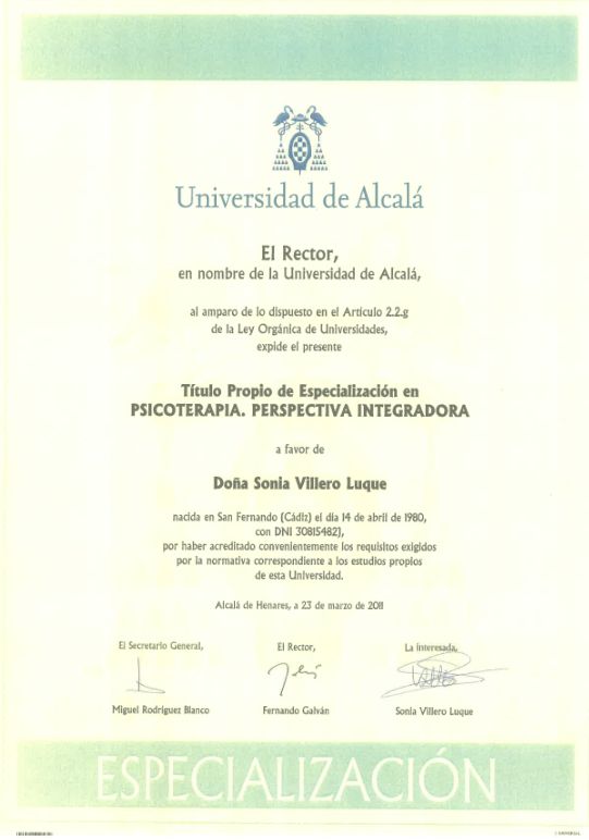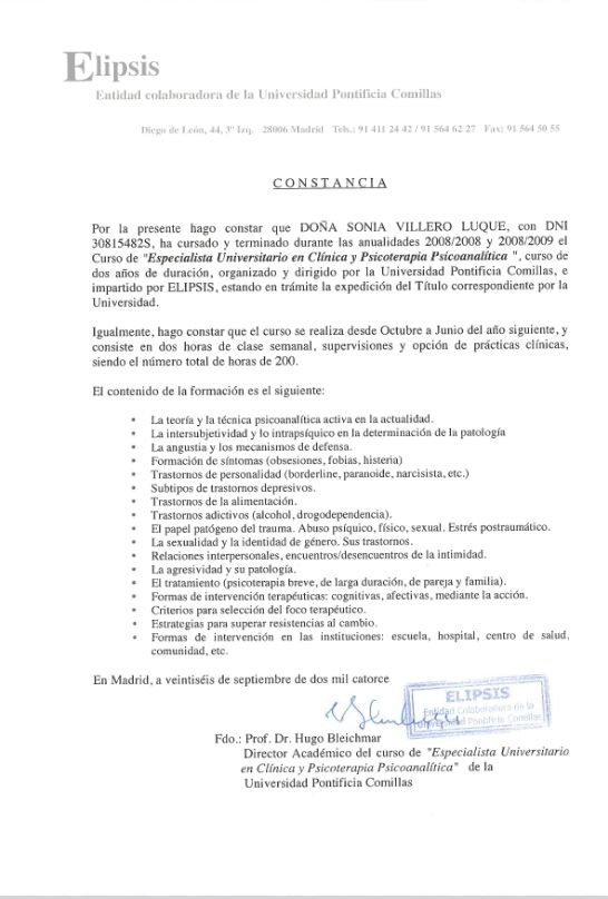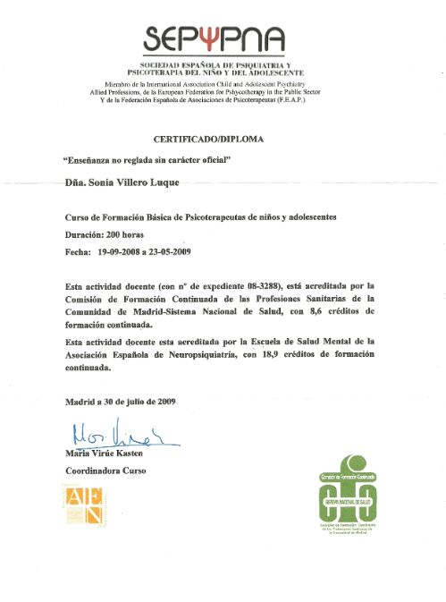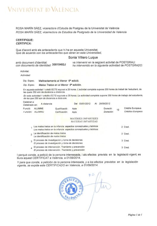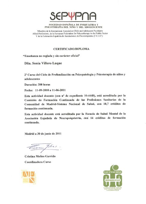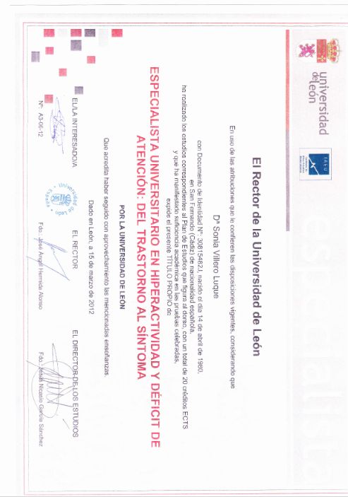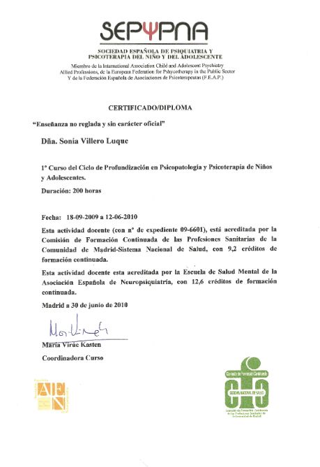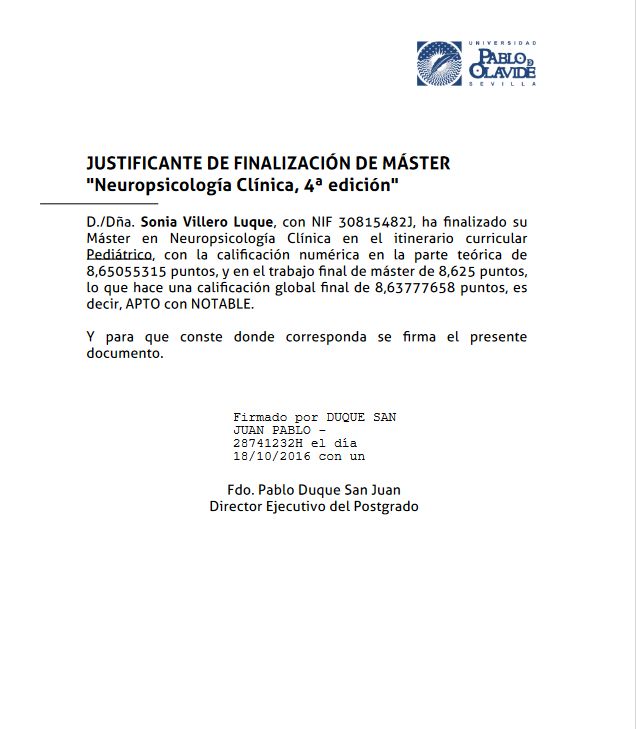 He obtenido varios títulos de posgrado universitario especialmente en áreas de psicoterapia del niño y del adolescente, neuropsicología y trastornos del desarrollo. La temática de mi Diploma de Estudios Avanzados del programa de doctorado de la Universidad Complutense de Madrid versaba sobre Neuroimagen y Síndrome de Asperger.