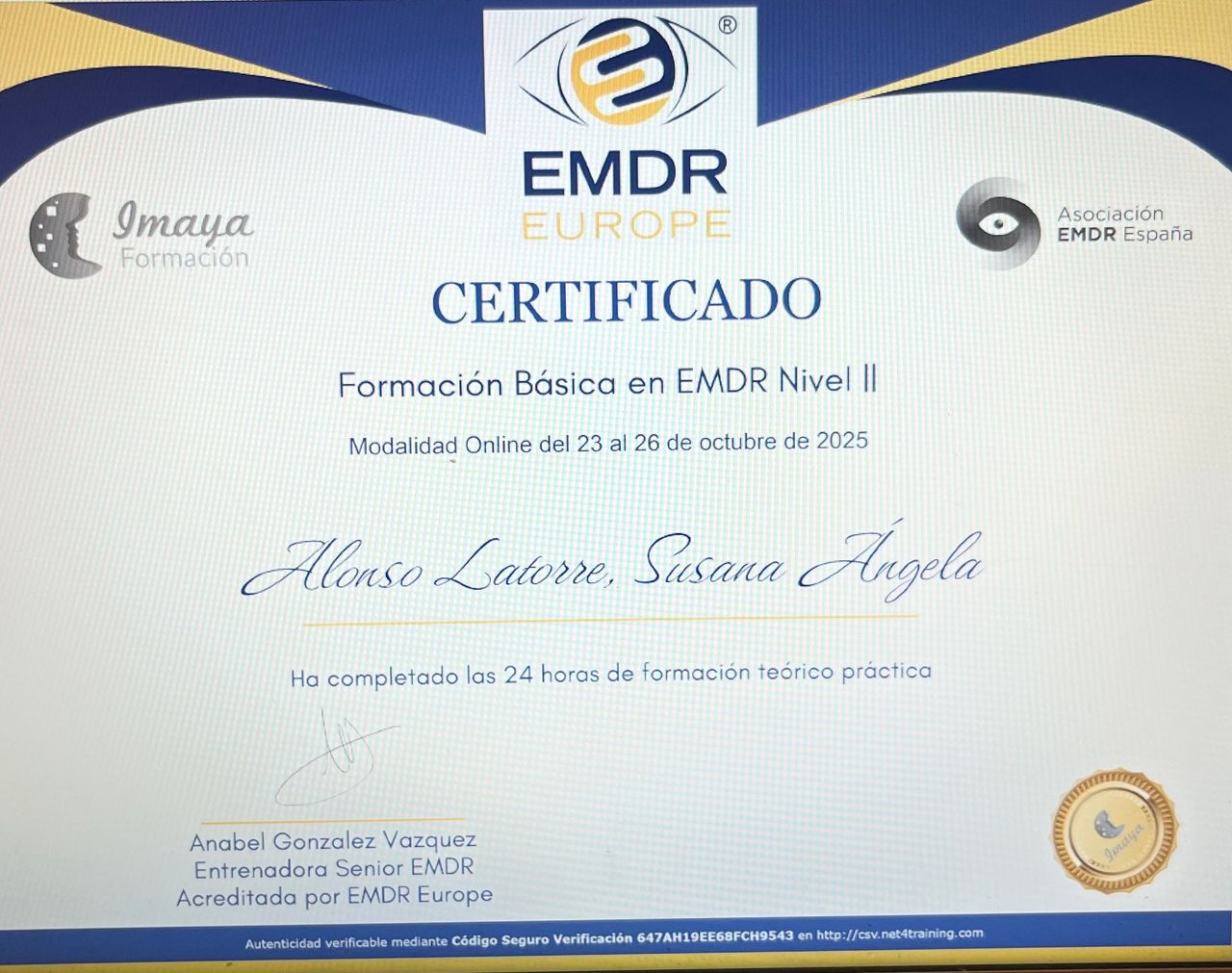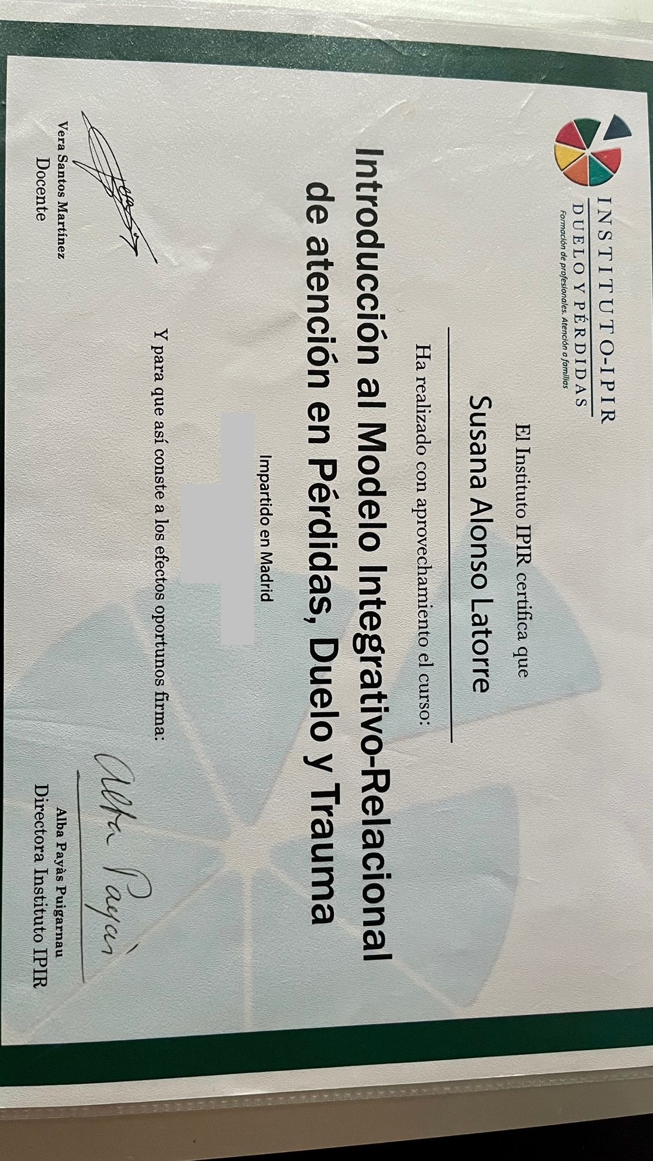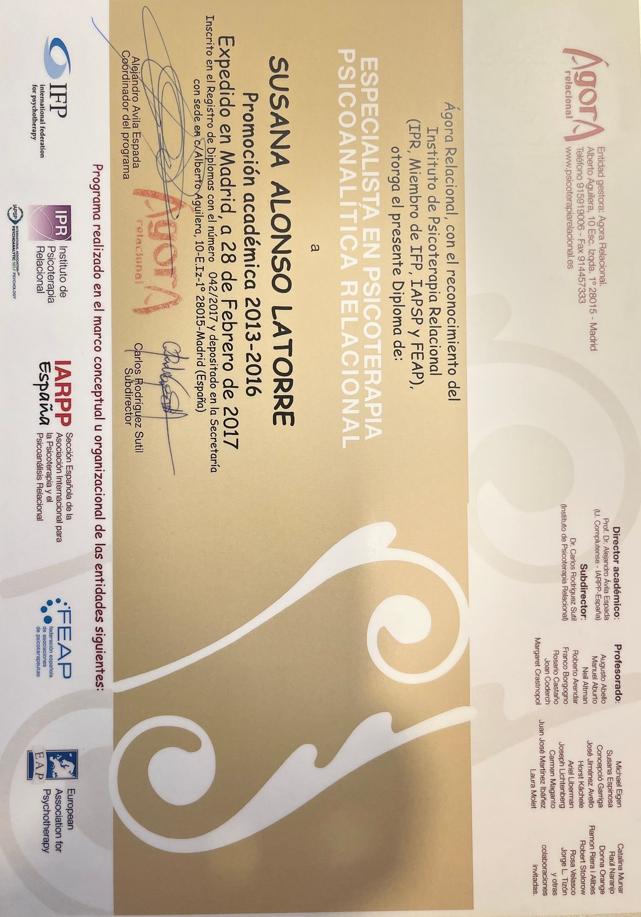También realicé el programa de formación en Psicoterapia Psicoanalítica Relacional en IARPP España (la Sección Española de la Asociación Internacional para la Psicoterapia y el Psicoanálisis Relacional). Formación reconocida por la Federación Española de Asociaciones de Psicoterapeutas, la Federación Europea de Asociaciones de Psicólogos y la Comisión Nacional de Formación Continuada de las profesiones sanitarias de la C.A.M.