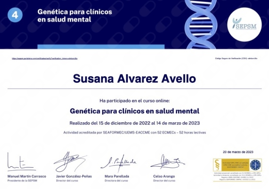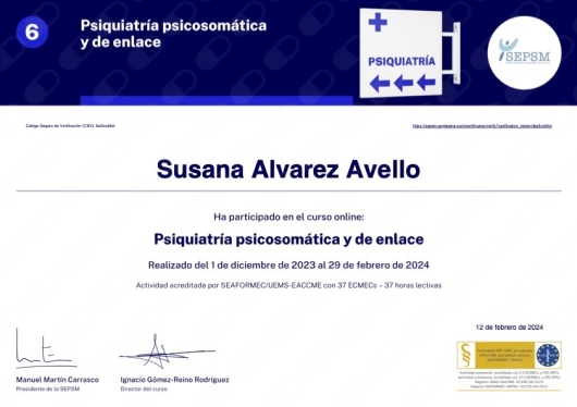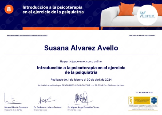 ¿Cuáles son las principales especialidades de Susana Avello?Susana Avello es psiquiatra. Te mostramos algunos de los servicios que ofrece gracias a su trayectoria y amplia experiencia: Evaluación de la competencia, Tratamiento psicofarmacológico, Psicoterapia individual, Pruebas de farmacogenética, Visita Psiquiatría, Desintoxicación y deshabituación al alcohol, Diagnóstico y tratamiento para trastornos de ansiedad, Diagnóstico y tratamiento de los trastornos bipolares, Diagnóstico y tratamiento de los trastornos depresivos, Diagnóstico y tratamiento del trastorno obsesivo compulsivo (TOC).