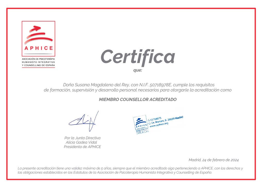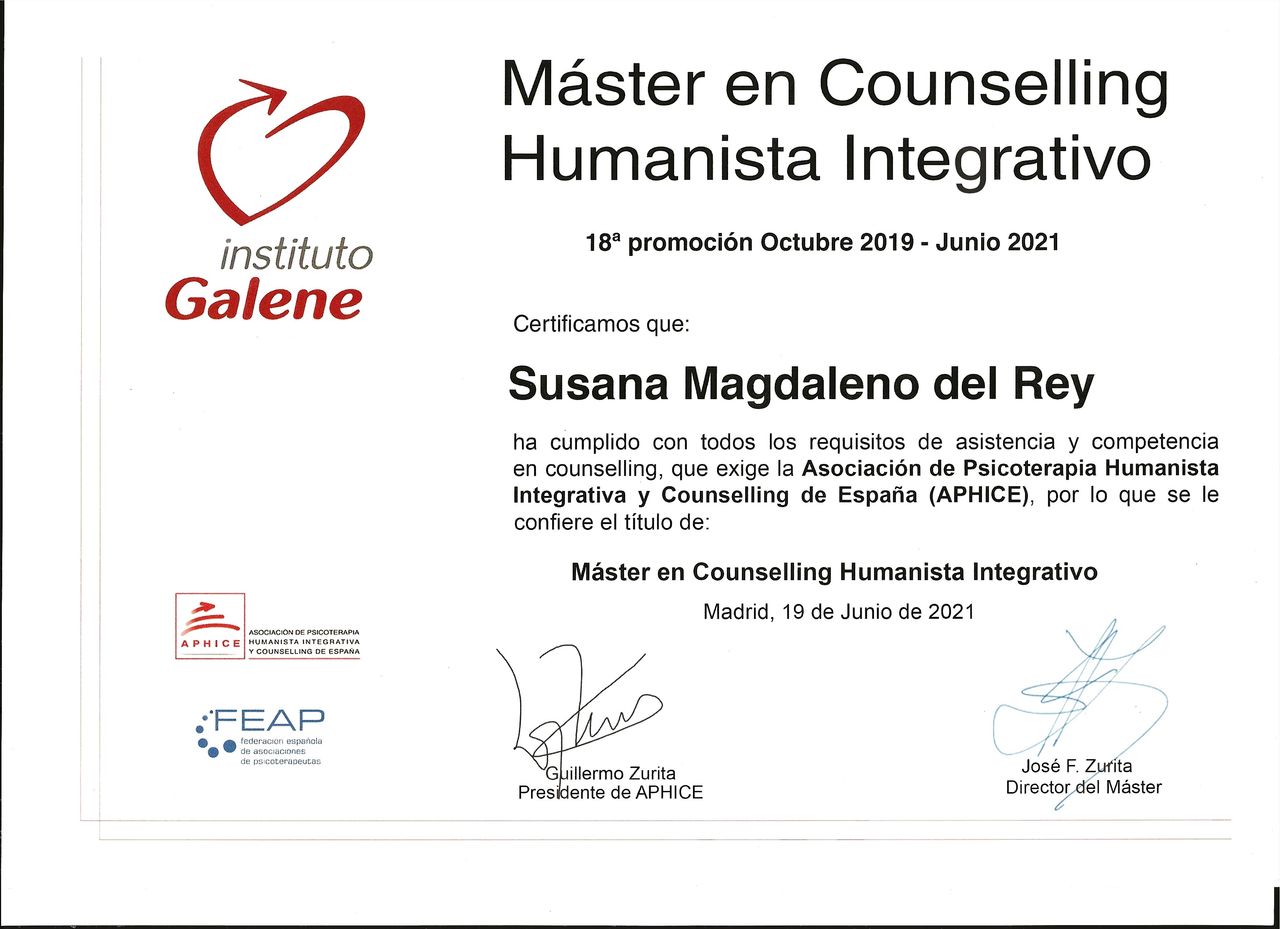 ¿Cuáles son las principales especialidades de Susana Magdaleno del Rey?Susana Magdaleno del Rey es terapeuta complementaria. Te mostramos algunos de los servicios que ofrece gracias a su trayectoria y amplia experiencia: Visita Medicina Complementaria y terapias alternativas, Counselling Humanista Integrativo, Terapia de reprocesamiento del trauma, Counselling (Terapia), Problemas de inseguridad y autoestima, Desarrollo y crecimiento personal, Acompañamiento en el proceso de duelo, Coaching, Terapia, Gestión del estrés.