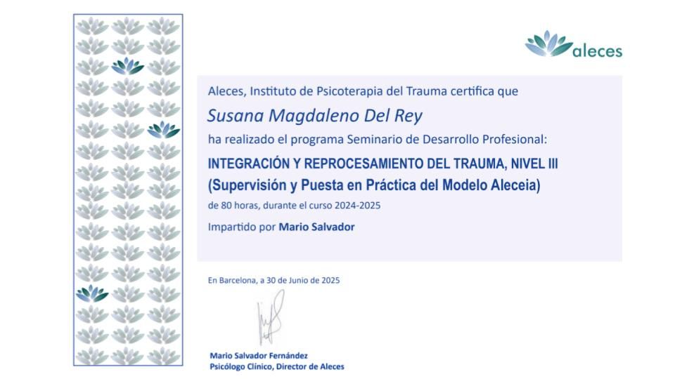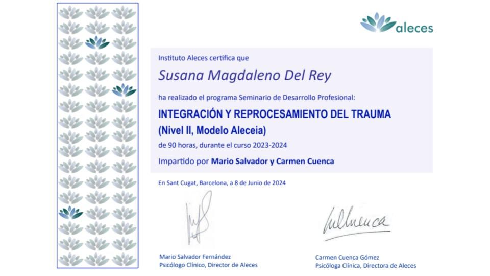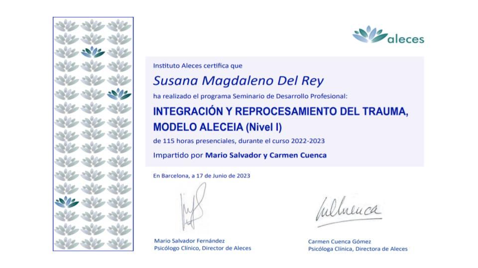 Me llamo Susana Magdaleno y soy Especialista en Acompañamiento Terapéutico Humanista, enfocada particularmente en el reprocesamiento del trauma, la liberación emocional y el desarrollo personal, y Coach profesional y de vida.