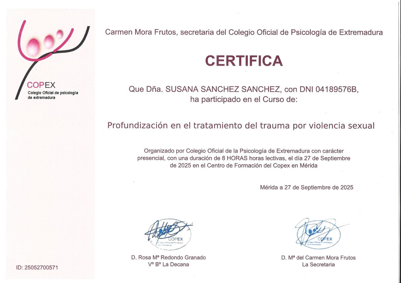 ¿Cuáles son las principales especialidades de Susana Sánchez Sánchez?Susana Sánchez Sánchez es psicóloga. Te mostramos algunos de los servicios que ofrece gracias a su trayectoria y amplia experiencia: Consulta online, Consulta presencial, Terapia de duelo, Psicoterapia en adolescentes, Psicoterapia individual, Terapia cognitivo-conductual, Terapia de pareja, Diagnóstico y tratamiento para trastornos de ansiedad, Terapia individual, Primera visita Psicología.