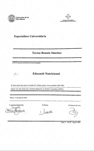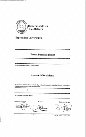 ¿Cuáles son las principales especialidades de Teresa Bonnin Sánchez?Teresa Bonnin Sánchez es dietista nutricionista. Te mostramos algunos de los servicios que ofrece gracias a su trayectoria y amplia experiencia: Visitas sucesivas Nutrición y Dietética, Nutrición deportiva, Tratamientos para el sobrepeso y la obesidad, Alimentación en el embarazo, Estudio antropométrico, Soporte nutricional en pacientes oncológicos, Nutrición clínica, Asesoría en la menopausia, Seguimiento Nutrición y Dietética, Control de menopausia.