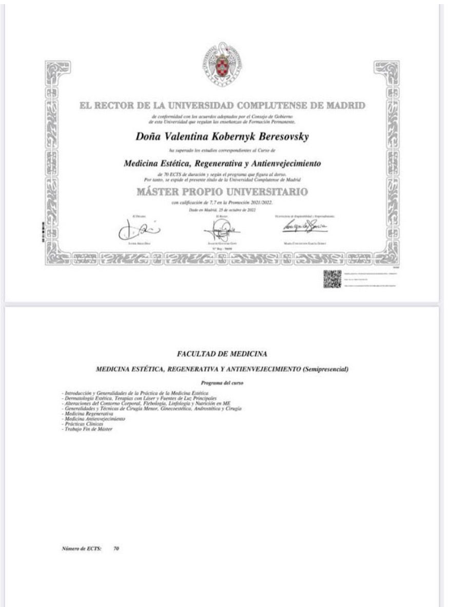 Cuenta con formación específica en este campo con Máster en Medicina Estética y Antienvejecimiento por la Universidad Complutense de Madrid que complementa su perfil clínico, combinando la atención médica de urgencias con procedimientos estéticos y regenerativos.