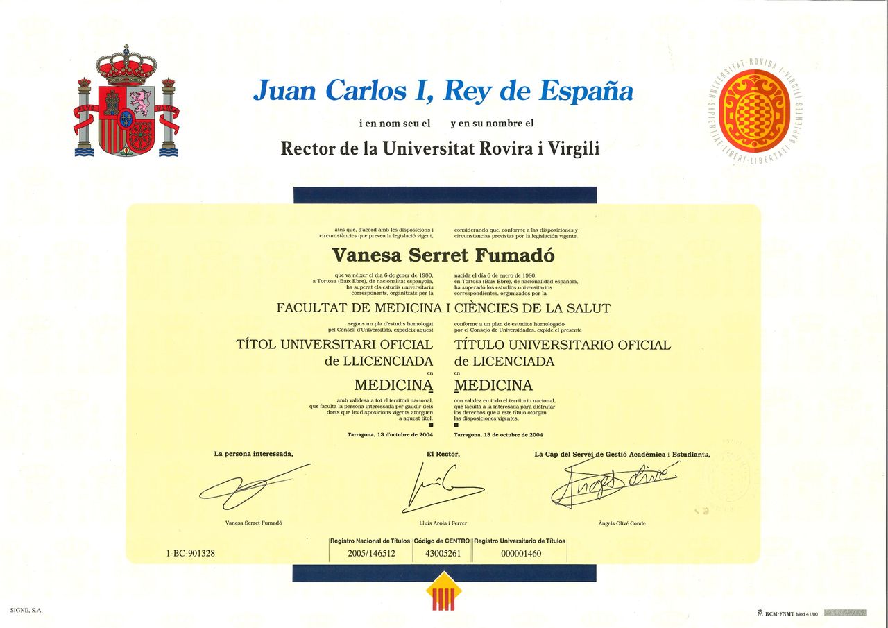 Licenciada en Medicina y Cirugía por la Universitat Rovira i Virgili.
