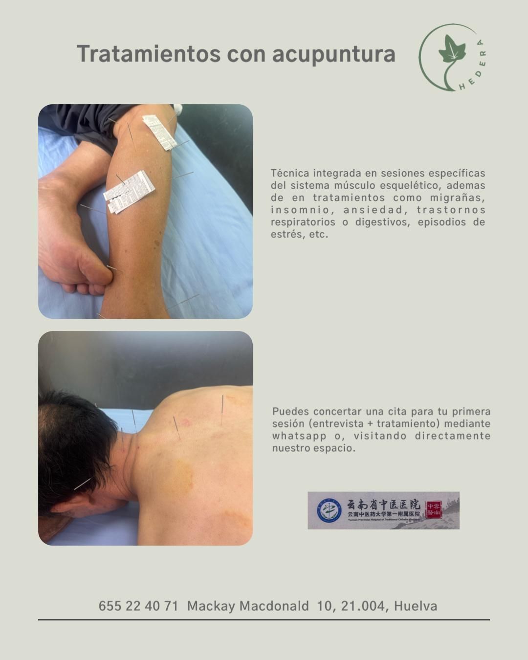 Acupuntura integrada en sesiones específicas del sistema músculo esquelético, además de en tratamientos como migrañas, insomnio, ansiedad, trastornos respiratorios o digestivos, episodios de estrés, etc.