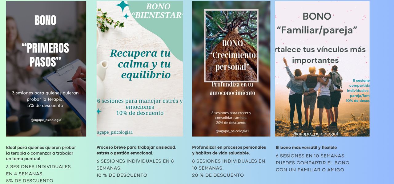 Actualmente tengo activos diferentes bonos de sesiones. Una manera de hacer más fácil y accesible la terapia a aquellas personas que lo requieran. Si quieres más información, contacta conmigo.