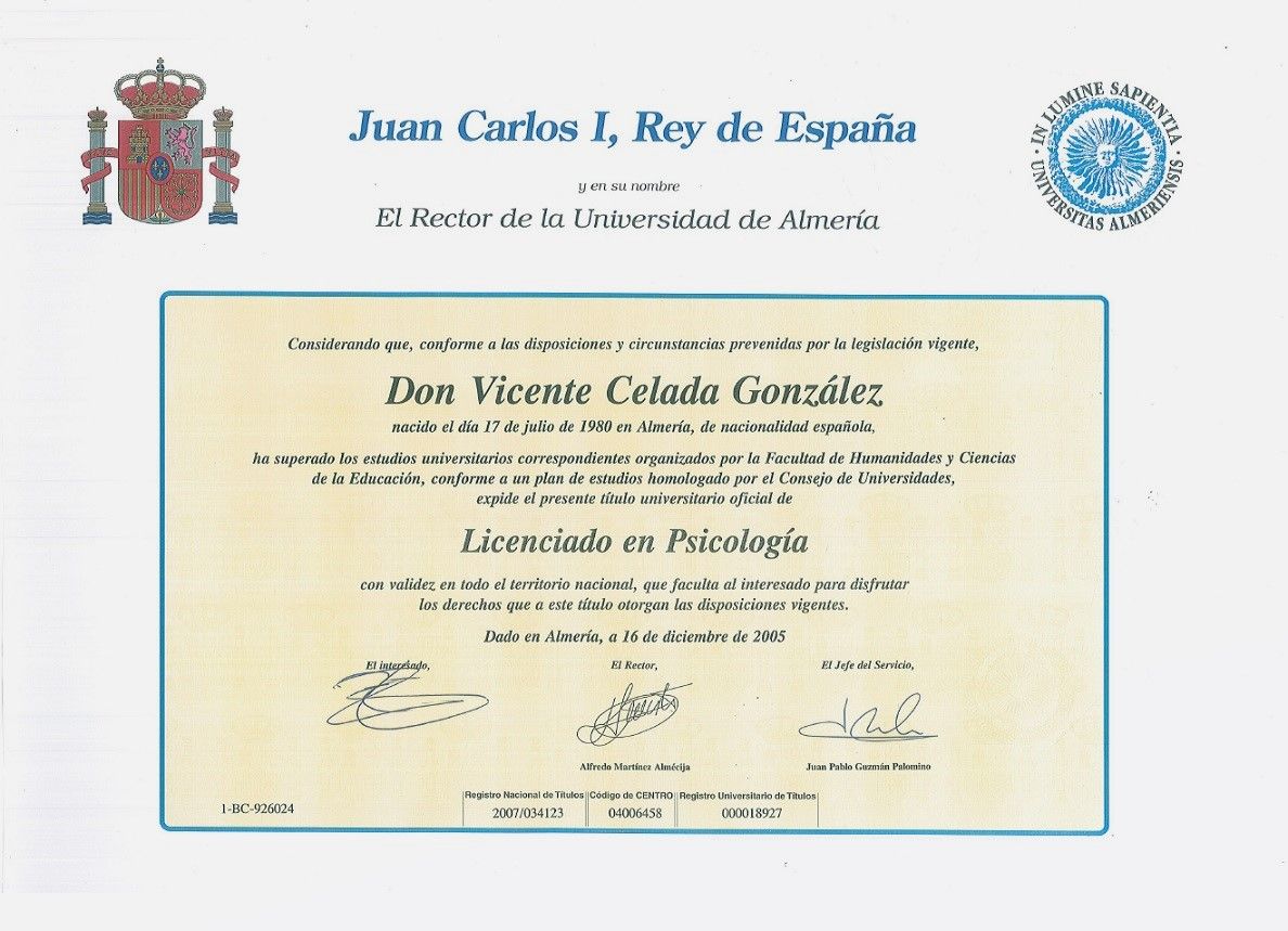 Buenos días, mi nombre es Vicente Celada. Soy psicólogo por la Universidad de Almería desde 2005. Vivo y tengo consulta en Roquetas de Mar, Almería. Mi aproximación a la terapia es humanista, poniendo en el centro a la persona y sus necesidades. Considero que para la eficacia de la terapia son claves: la empatía, la lealtad, el compromiso con el paciente, la cercanía e identificar los objetivos de la consulta. Estoy especializado en: trastornos de ansiedad, trastorno obsesivo-compulsivo, tartamudez, fobias, terapia de pareja, adicciones y autoestima.